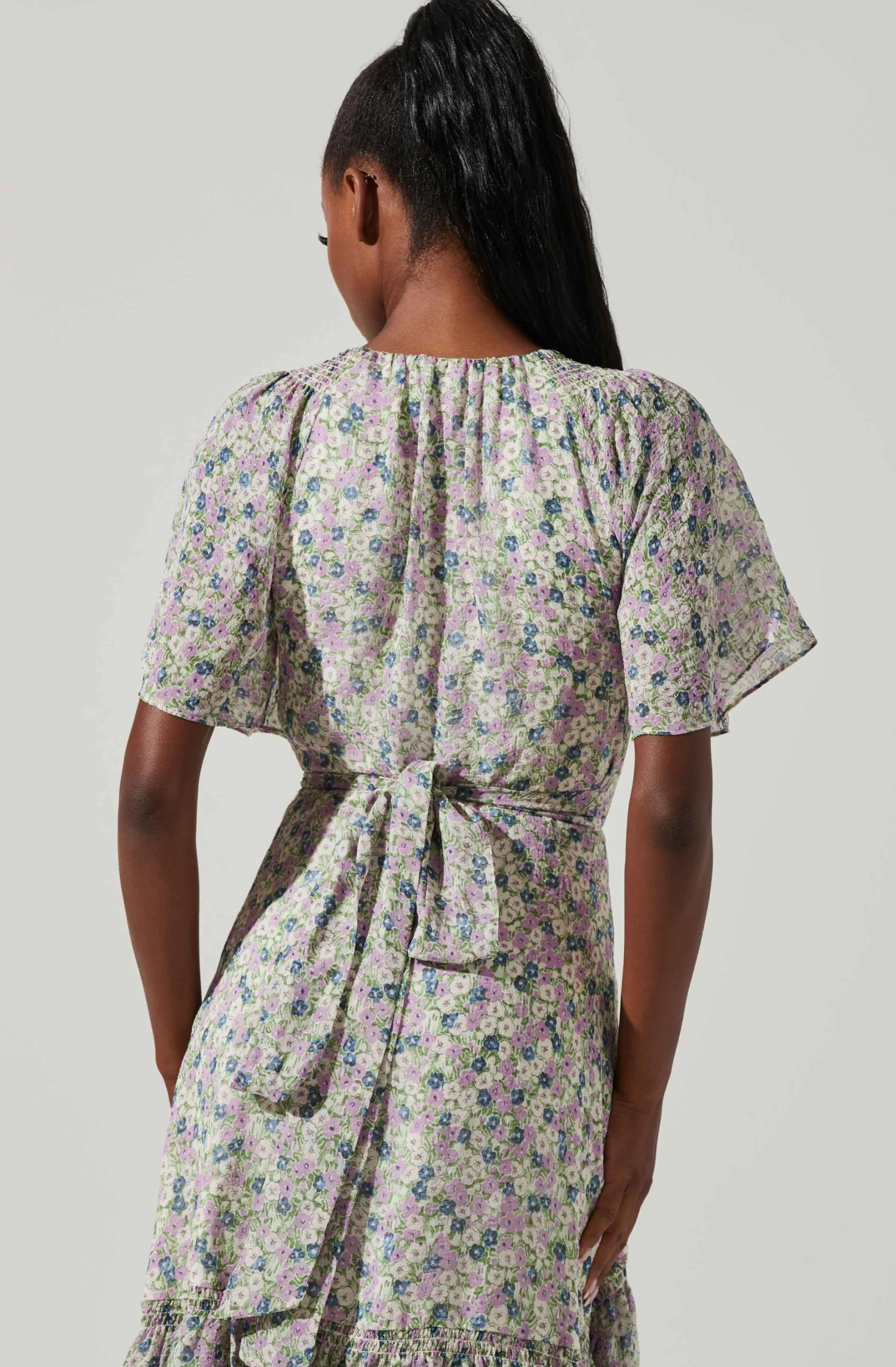 The Adella Dress features a floral print that instantly boosts your mood. Delicate V neck leads to a wrapped front and tiered, ruffle midi skirt. Short ruffle sleeves. Tie waist.