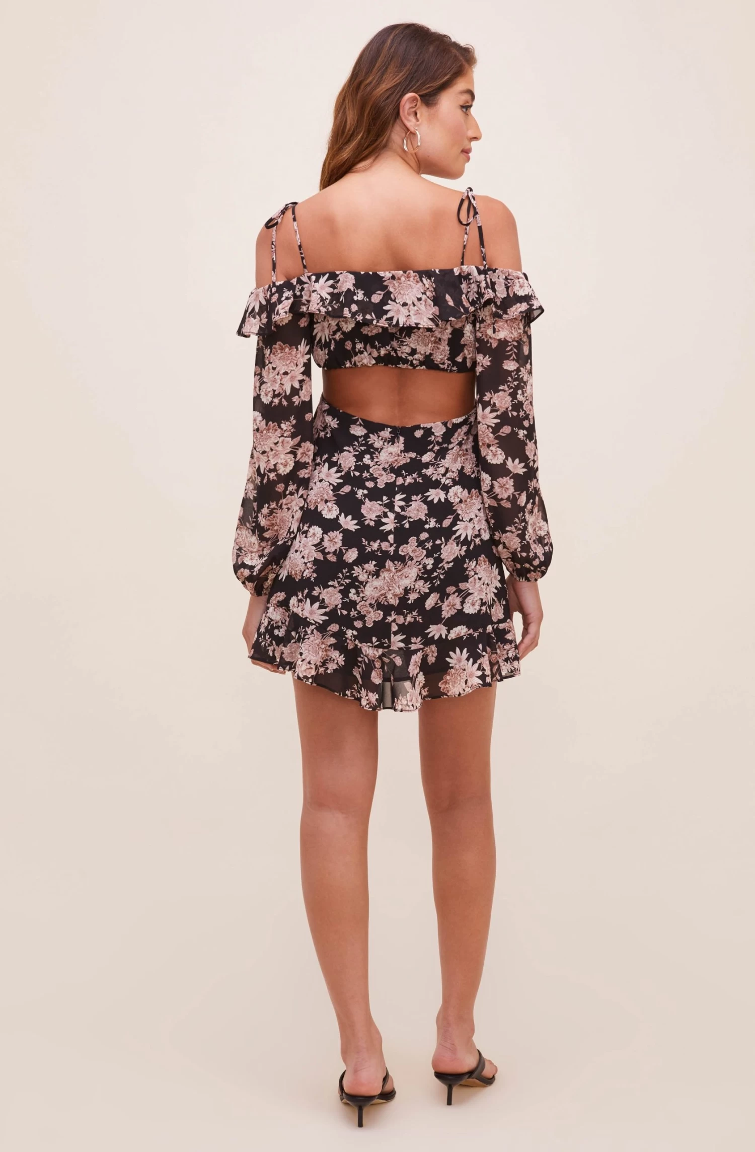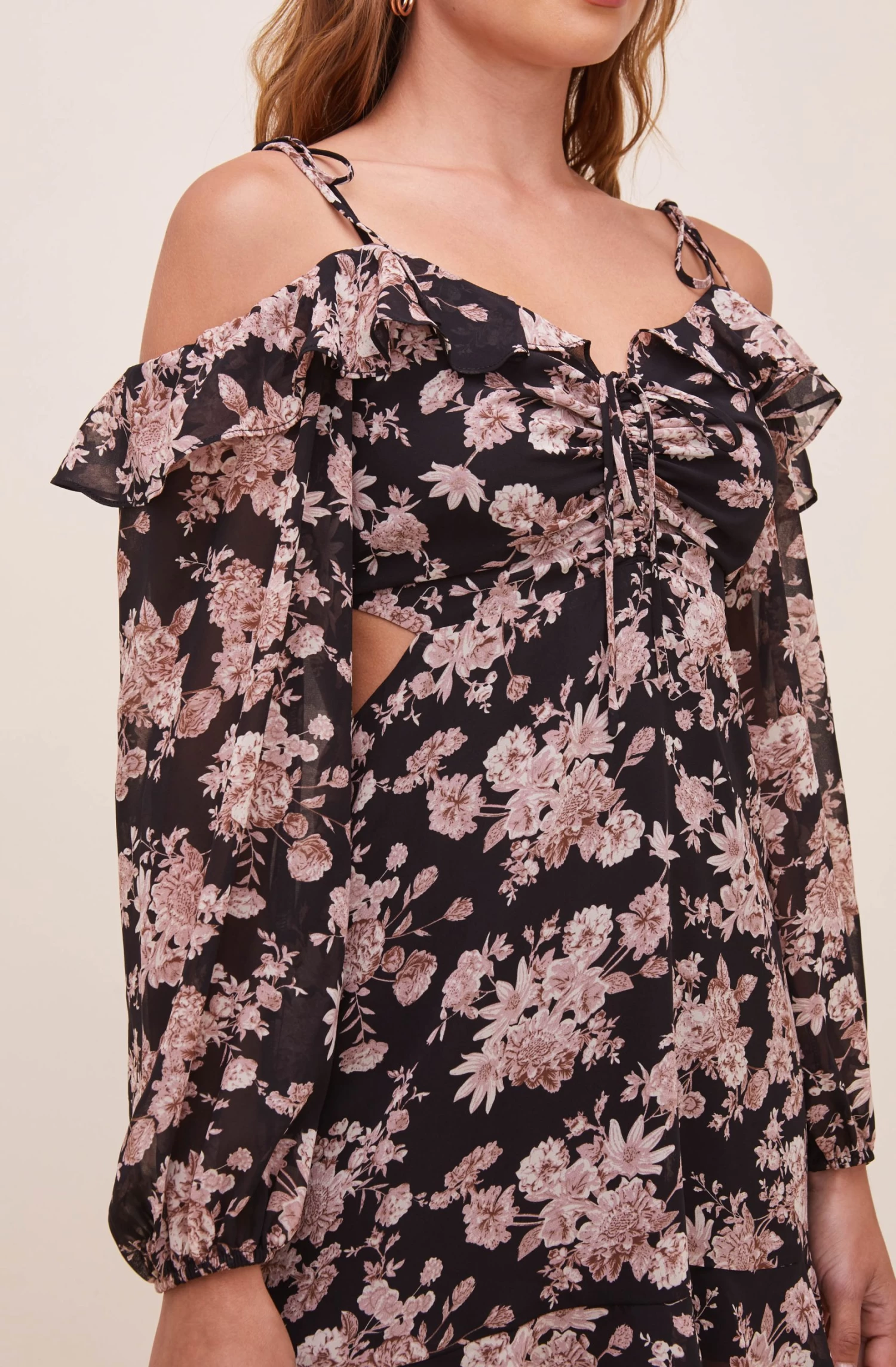 When it comes to statement dresses, the Anastasia dress stands out! It features a moody floral print throughout with cold shoulders and ruffle trim. Ruched front with drawstring accent leads to a fitted silhouette with cutout accents at the sides. Statement cutout back. Long sleeves.