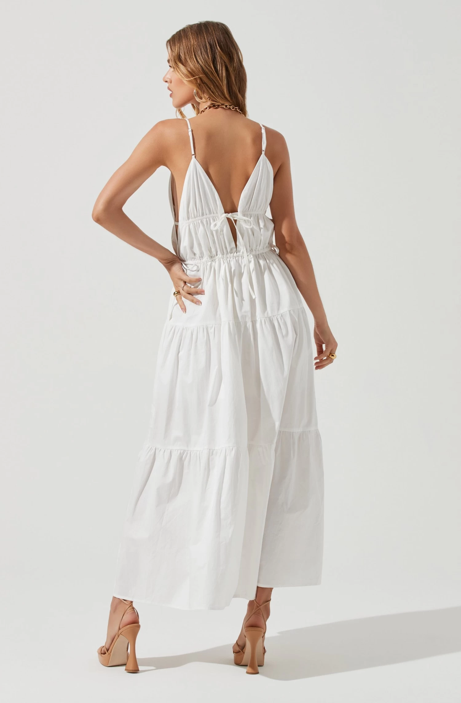 The Cassie Dress features a plunge neckline that leads to a cinched bodice with drawstring accents. Tiered maxi skirt. Side pockets.