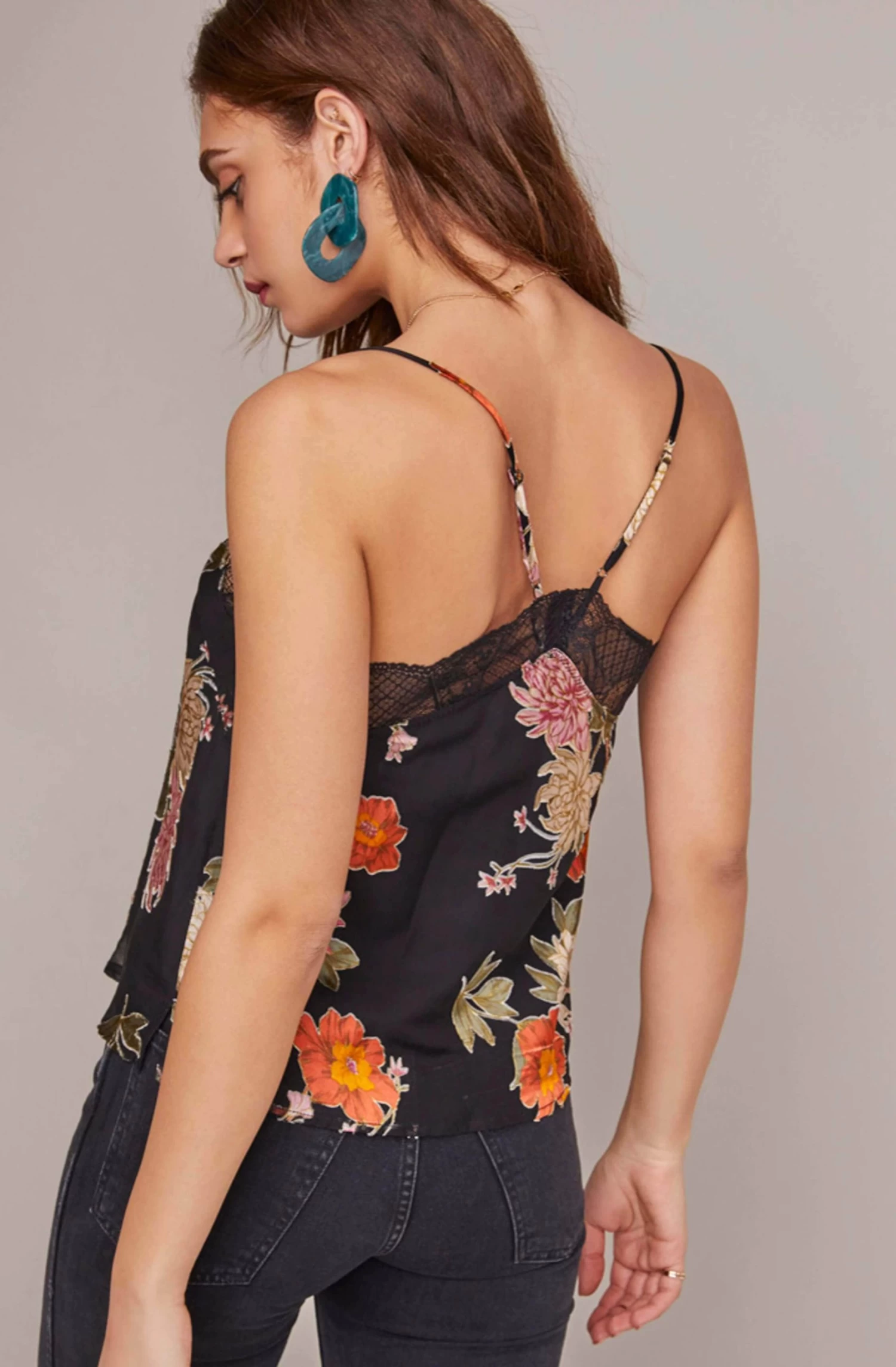 A statement piece for autumn outfitting. Scalloped lace trim decorates a V neckline supported by delicate spaghetti straps. Vibrant floral print evokes autumn romance. Relaxed bodice. Cross strap back.