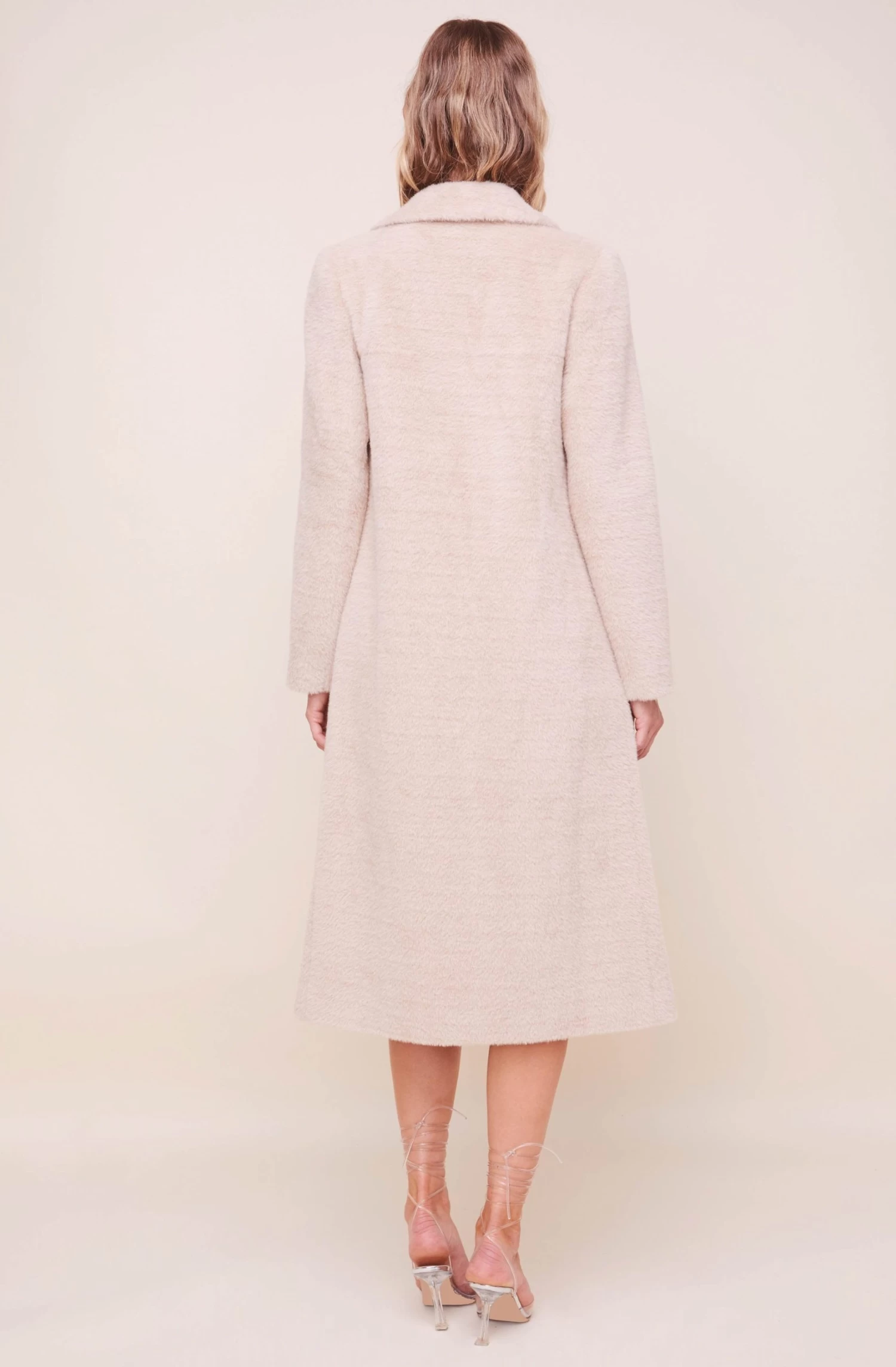 Keep the cold out. The Daria Coat features a sleek midi length with a notched collar, double breasted front and slanted flap pockets.