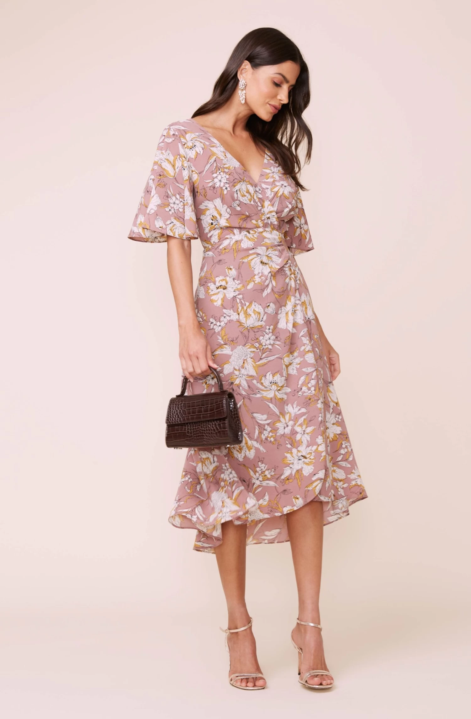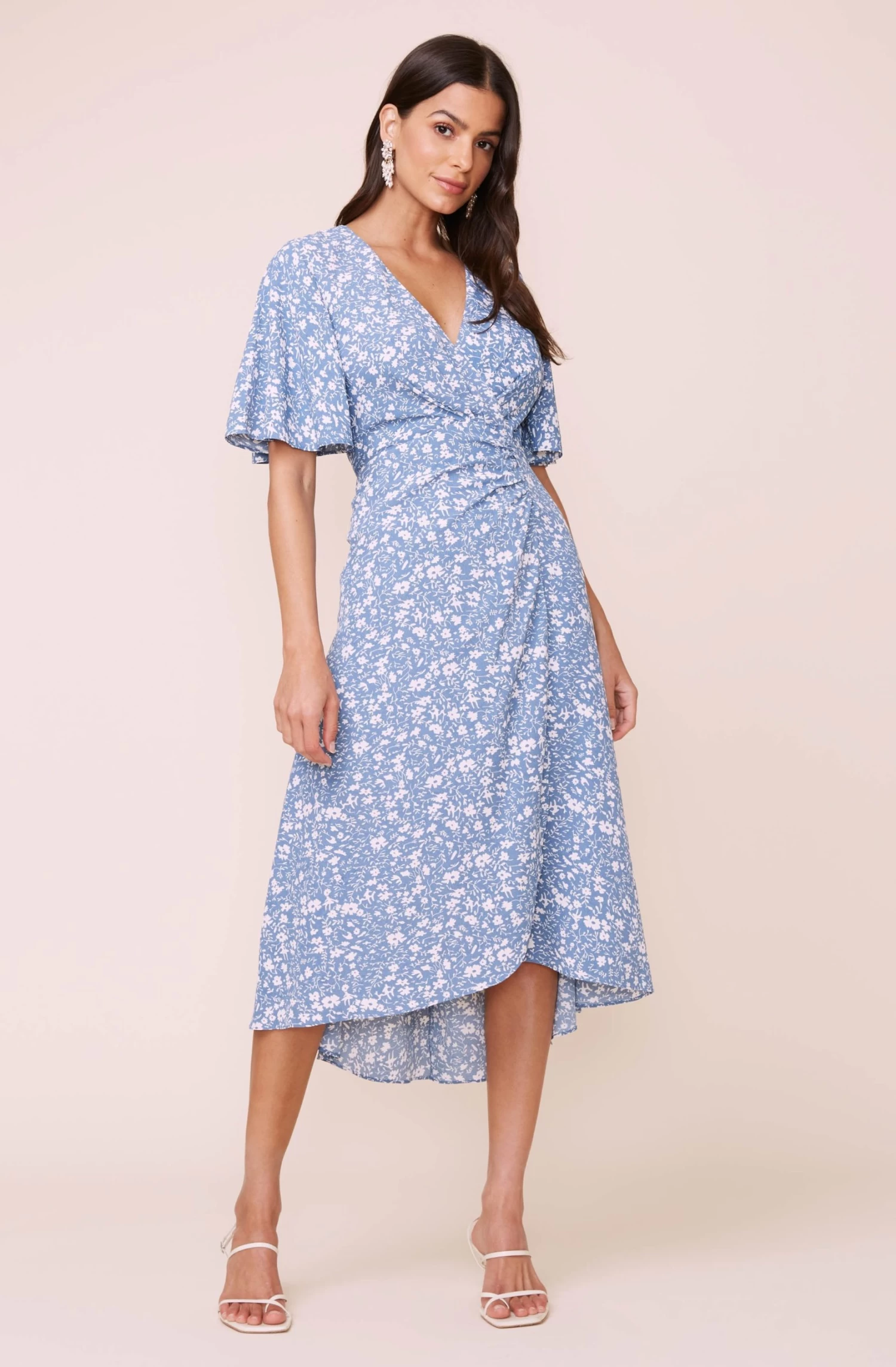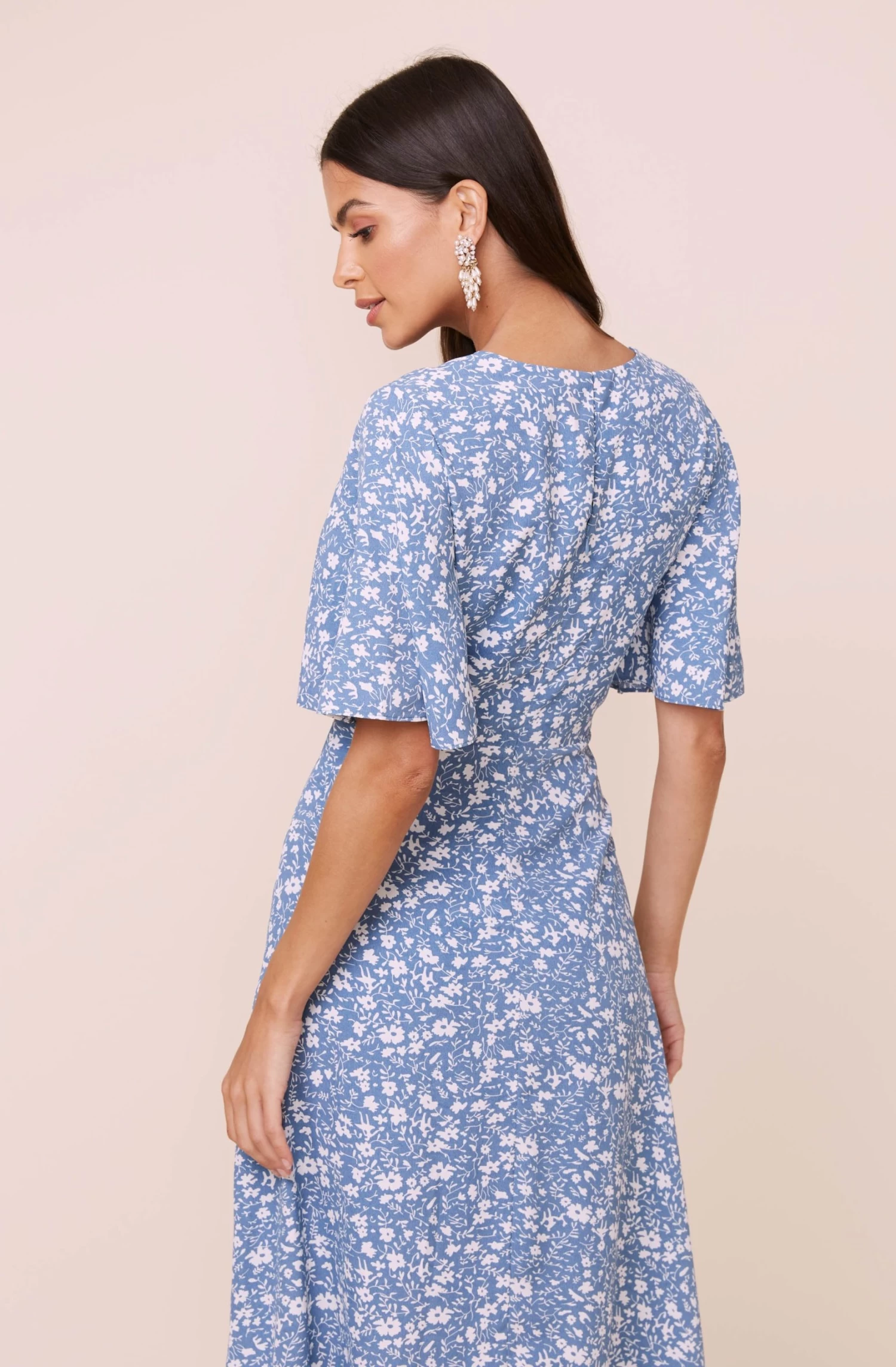 It all feels like a dream! The Delaney Dress features a romantic floral print throughout. Plunge neckline descends to a fitted waist with gathered details. Flowy midi-length skirt features a subtle hi-low hemline. Short flutter sleeves.
