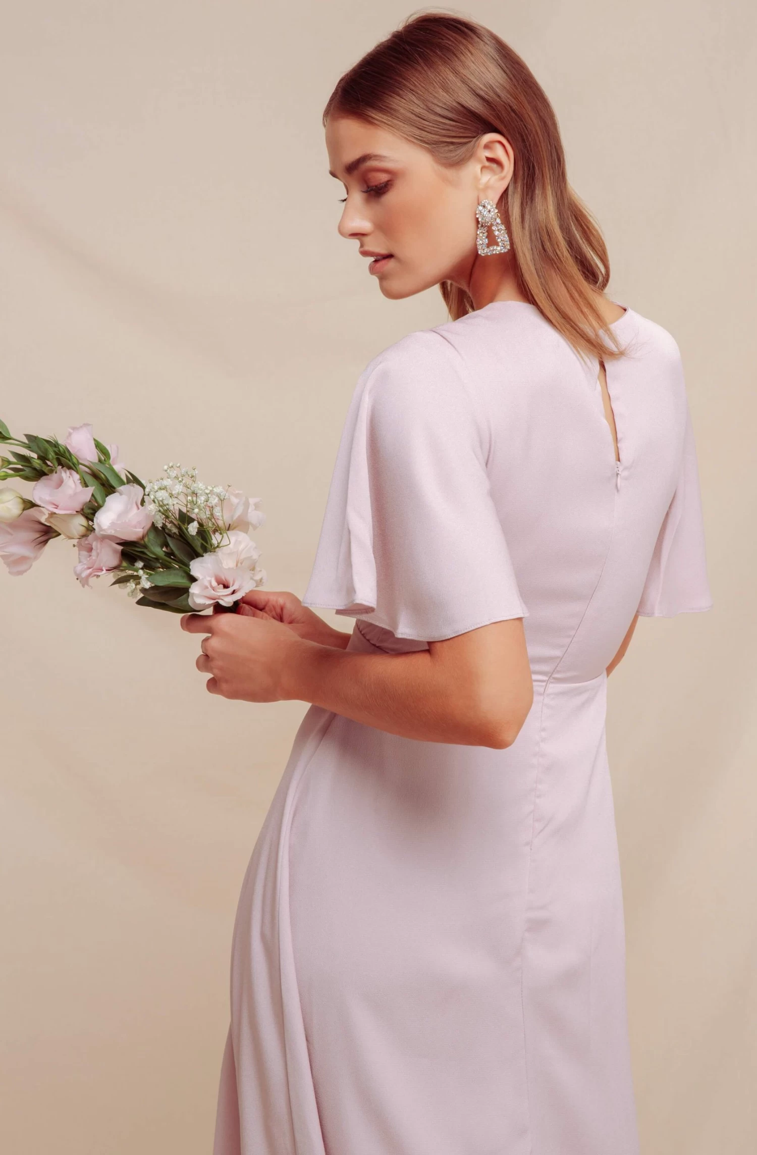 Set the tone this summer in pastel tones. This magical midi dress starts with short flutter sleeves that accentuate a plunging neckline and gather bodice. Ruched midi skirt leads to a front slit accent for ultimate romance. Keyhole back and concealed back zip closure.