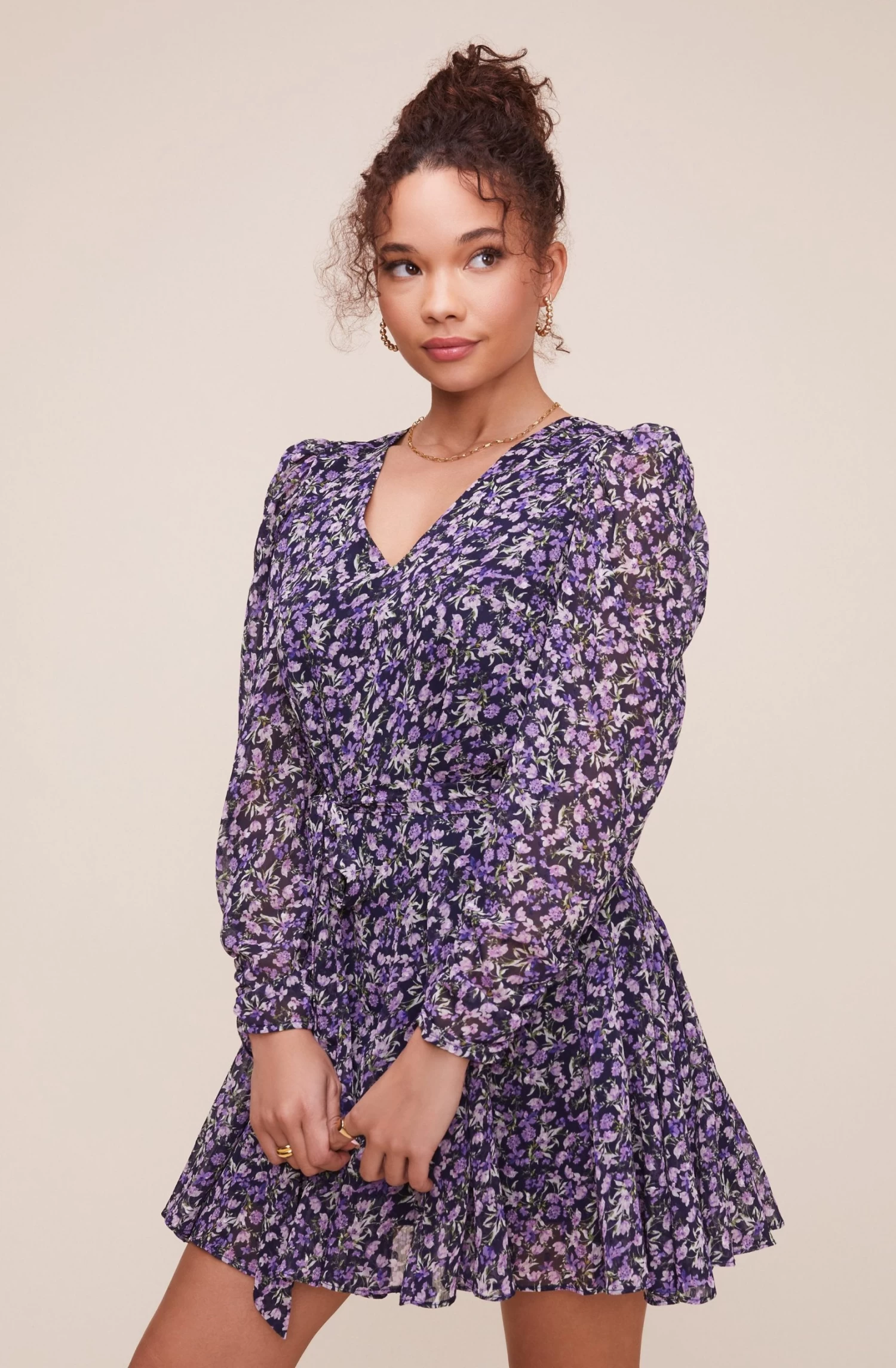 Pretty is easy in the Desiree Dress! It features a flattering V neckline that leads to a fitted bodice and flowy mini skirt. Semi-sheer long puff sleeves give us a dreamy effect. Ditzy floral print throughout.Â