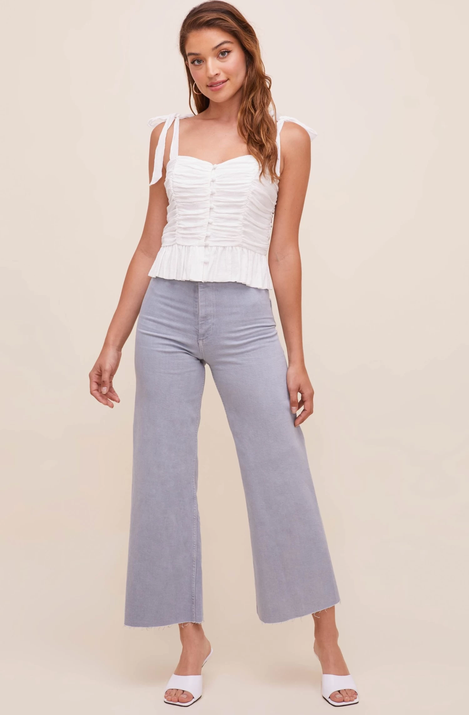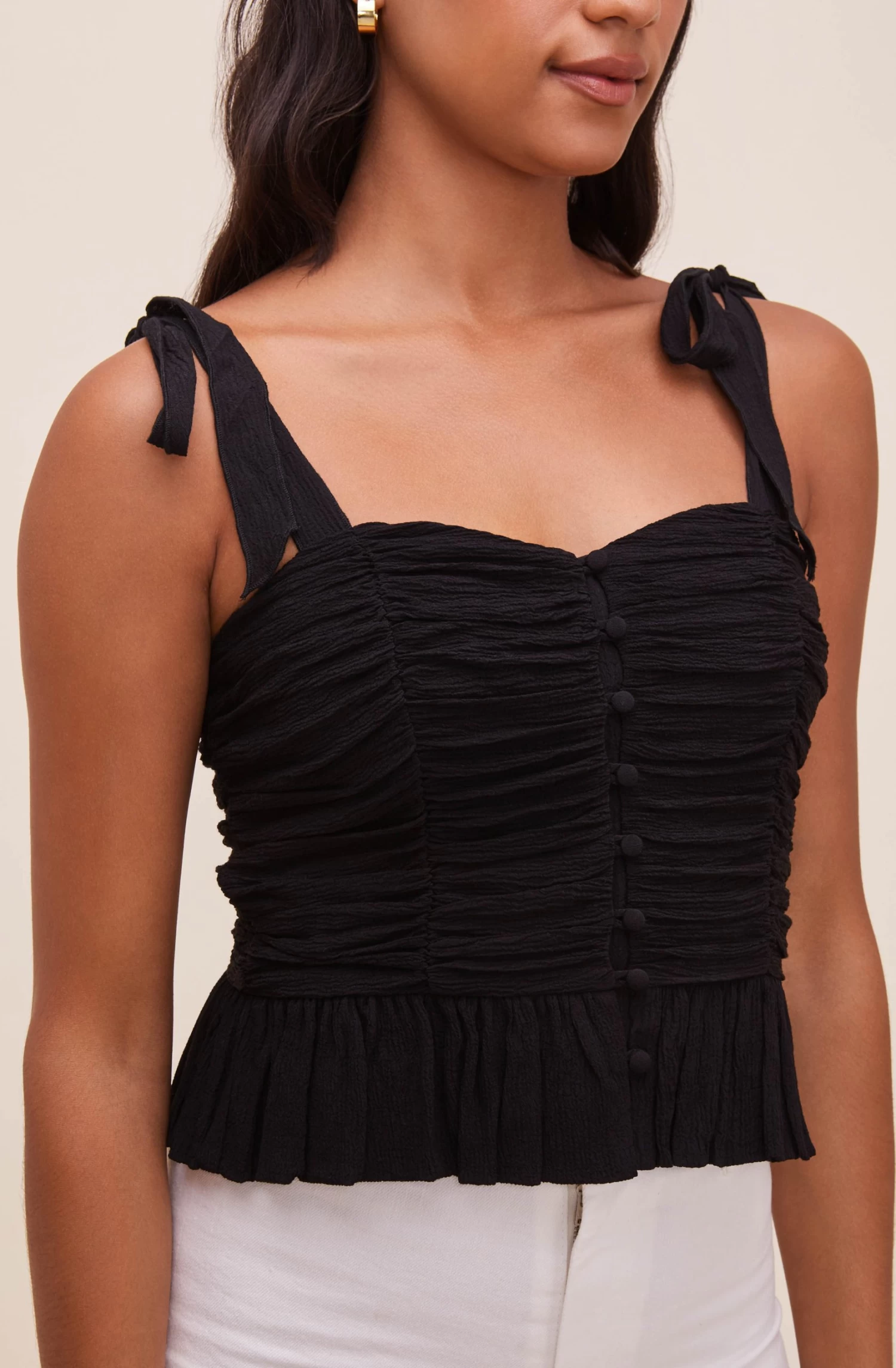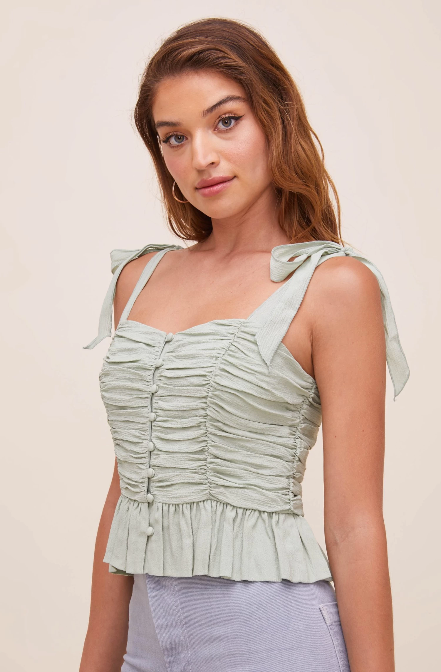 The Duffy Top features a stunning sweetheart neckline that leads to a ruched bodice and buttoned front. Tying straps. Subtle peplum hem. Smocked back.