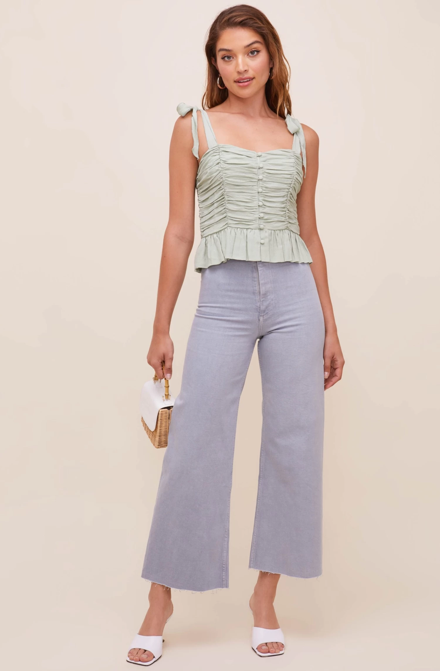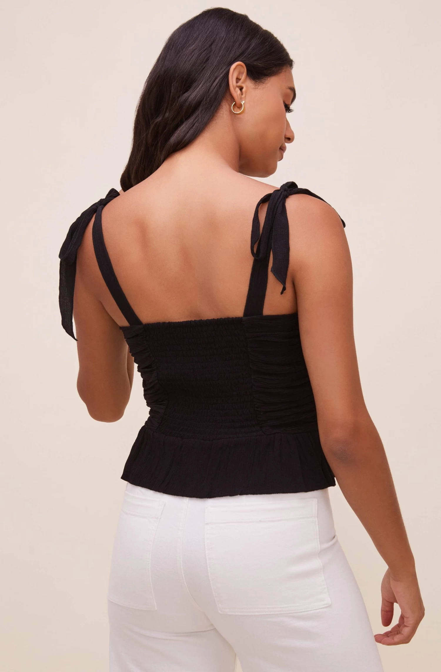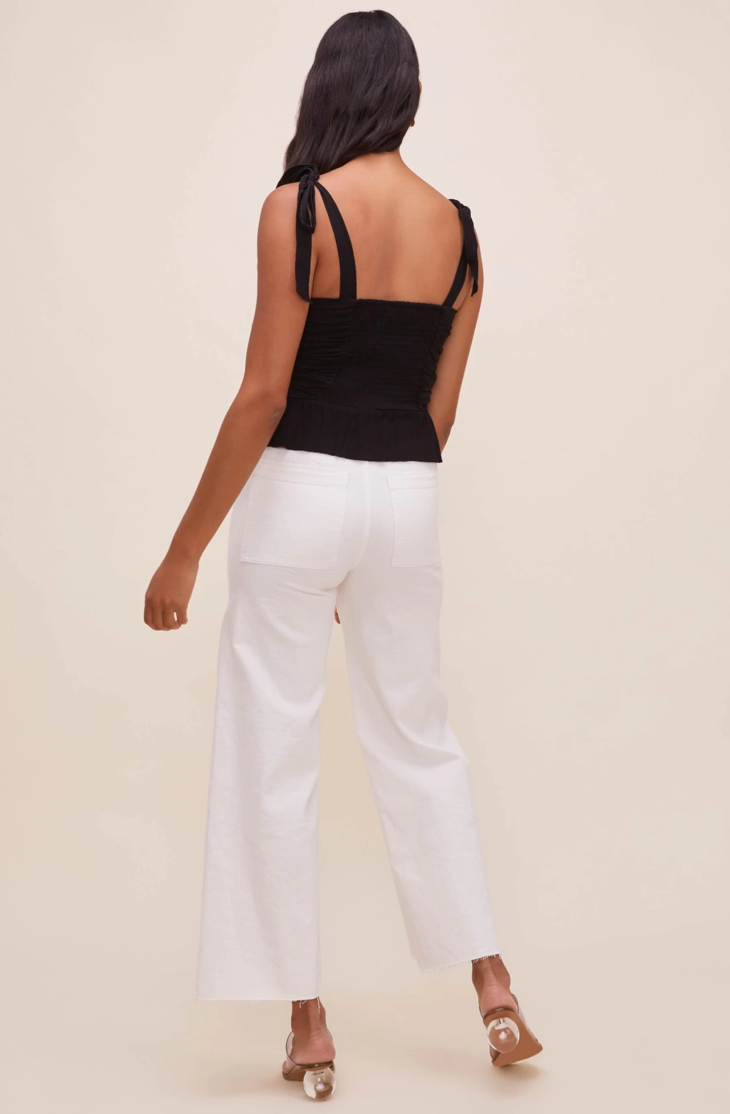 The Duffy Top features a stunning sweetheart neckline that leads to a ruched bodice and buttoned front. Tying straps. Subtle peplum hem. Smocked back.