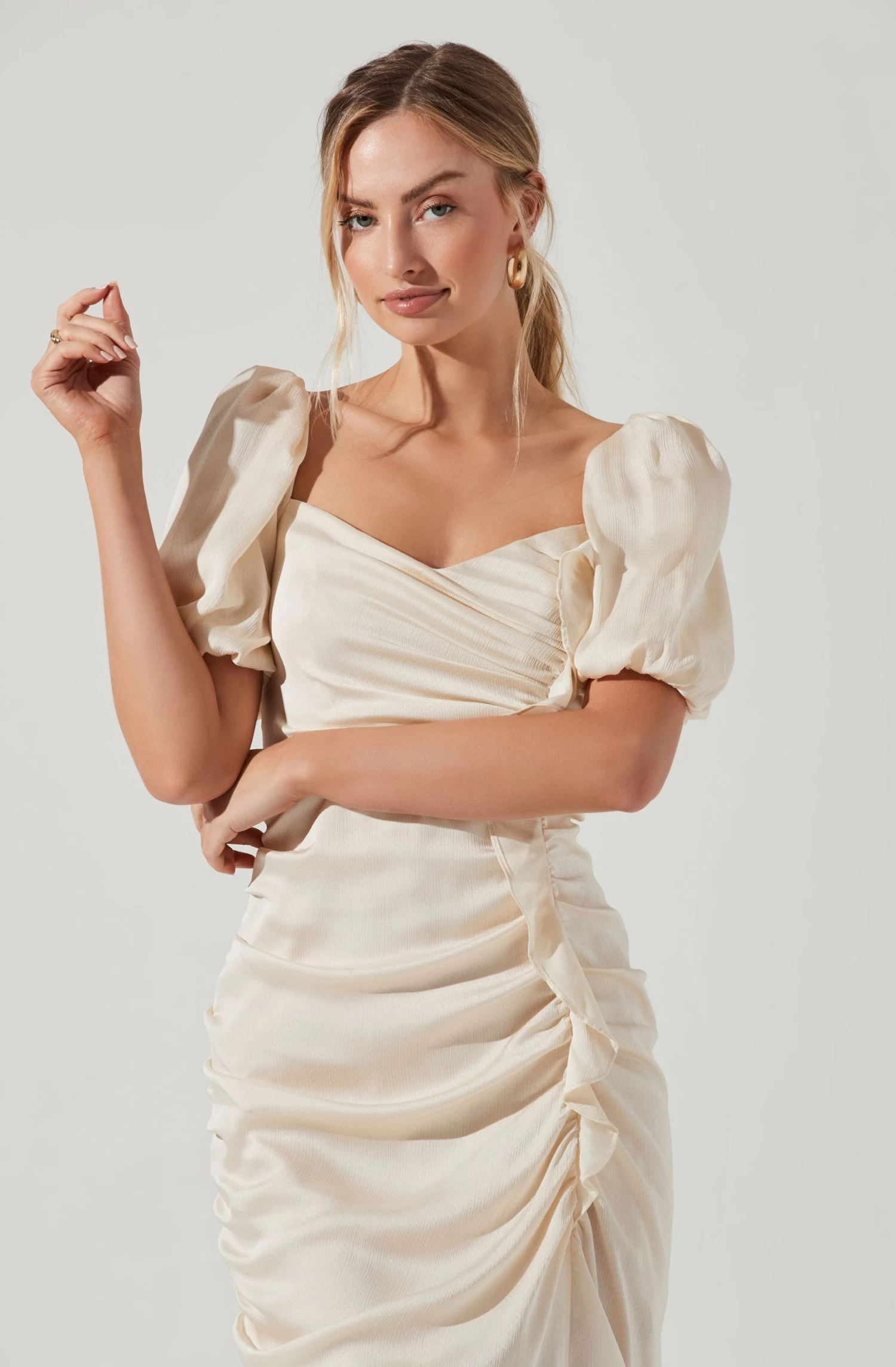 The Emma Dress features a sweetheart neckline that leads to a ruched bodice and ruffle trim. Short bubble sleeves. Smocked back.