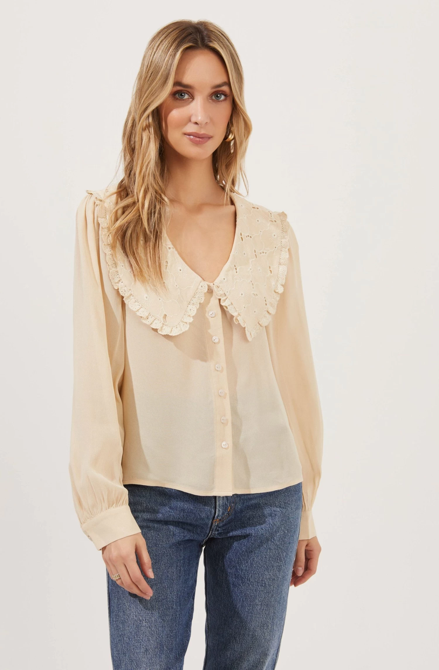 Charming and chic, the Evelyn Top is ready for a close up. It features a V neckline and an oversized embroidered collar with floral details and frilly edge. Buttoned front. Long sleeves with buttoned cuffs.