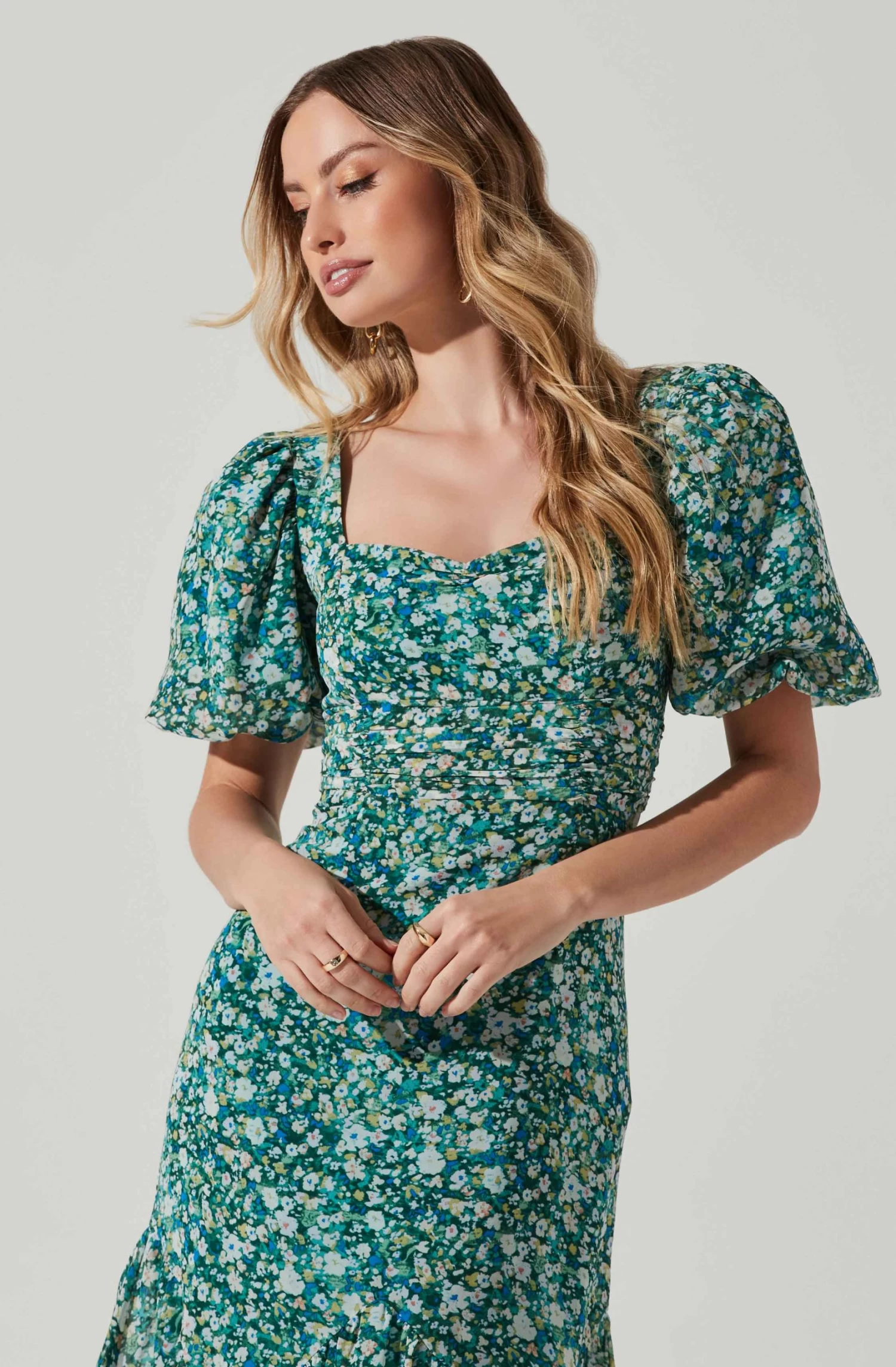 This elegant floral dress features a sweetheart neckline that leads to a ruched bodice and asymmetrical hemline. Short balloon sleeves. Smocked back. Lined.