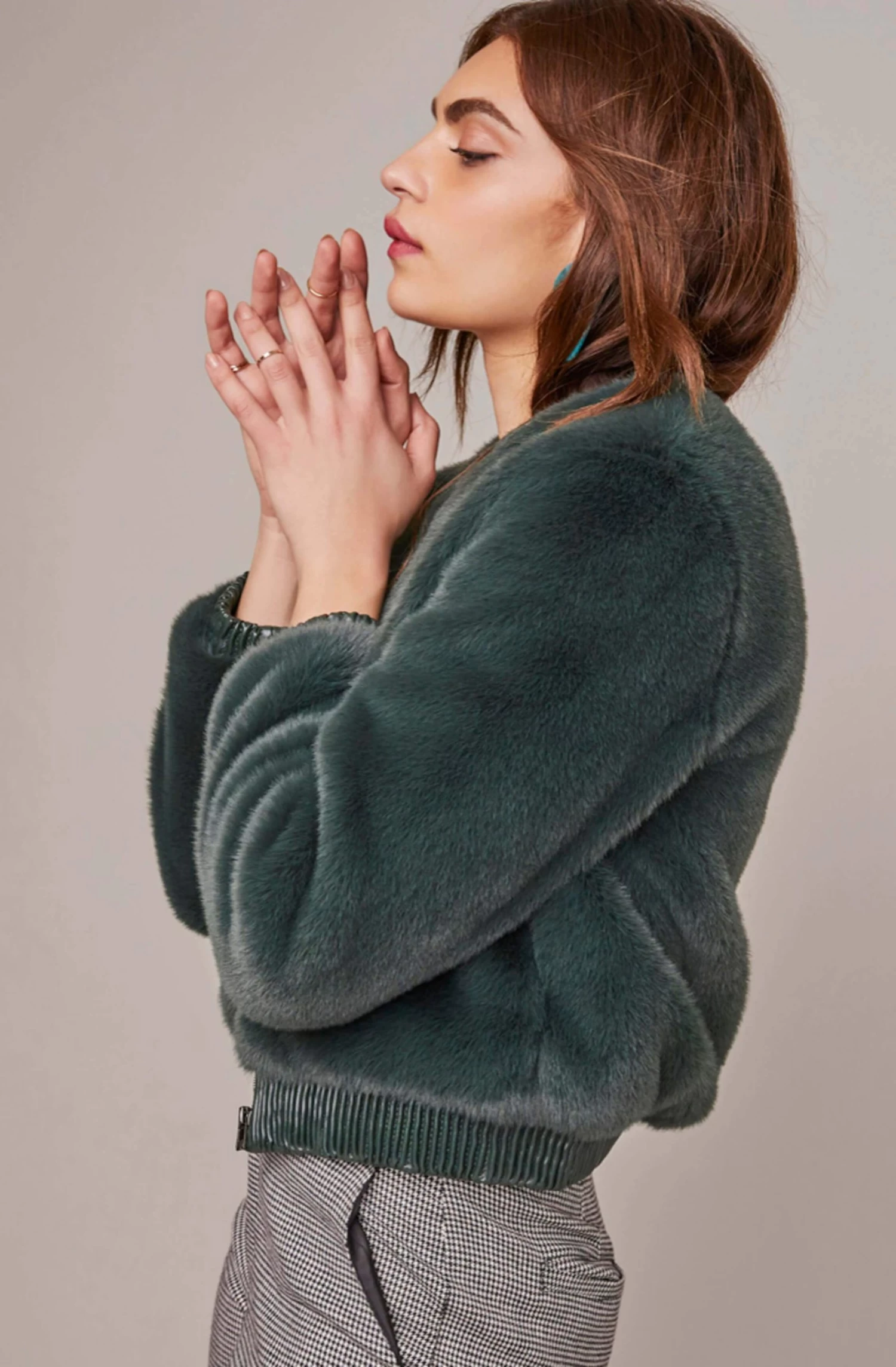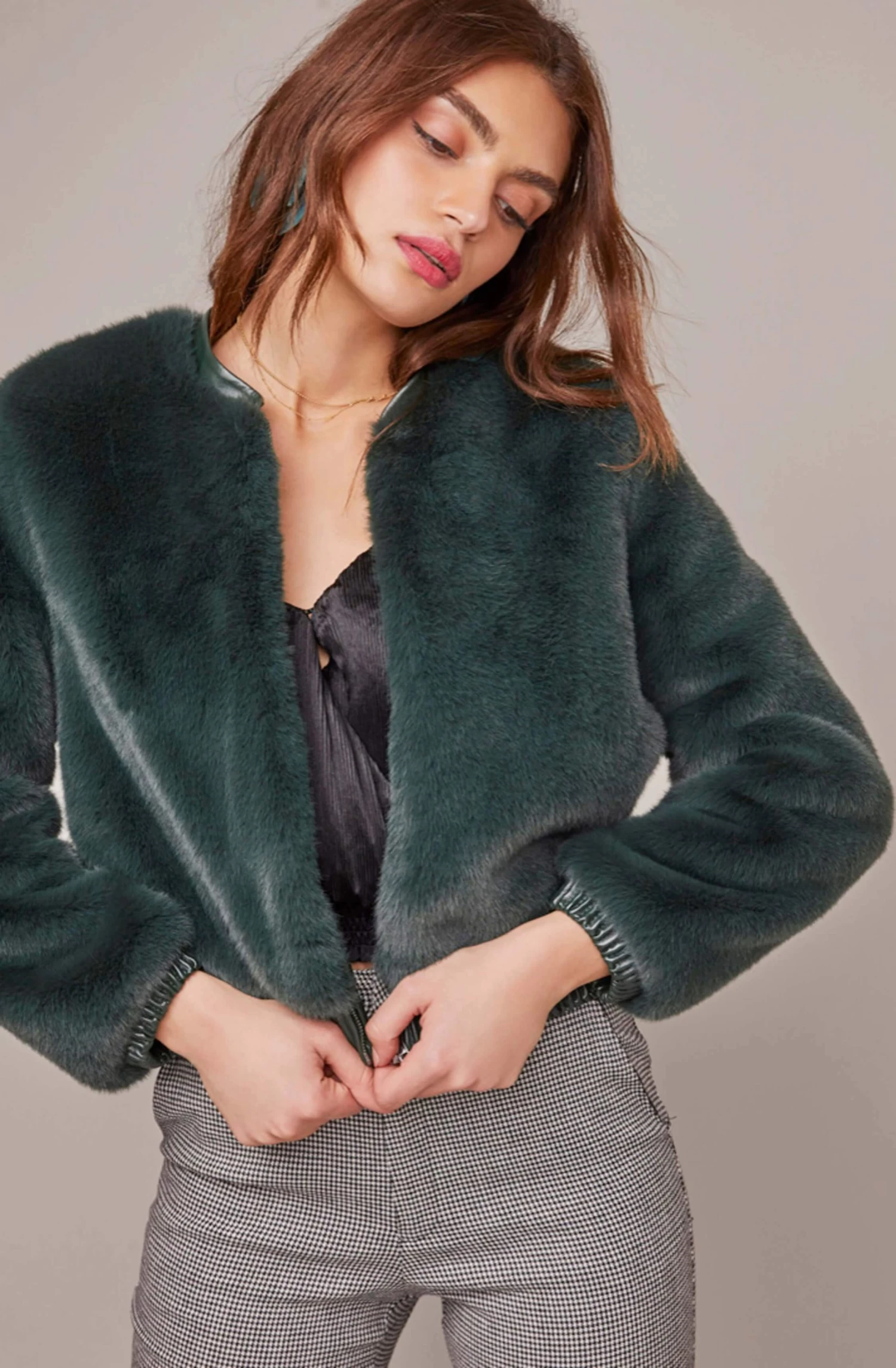Brave the cool days ahead in faux fur. This luxe jacket features a ribbed collar and cuffs along with slanted hip pocket accents. Long sleeves.