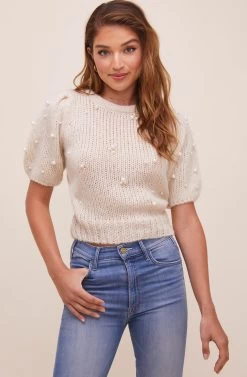 Treat yourself to pearls. This knit sweater features a classic round neckline and short puff sleeves. Multi-sized faux pearl embellishments adorn this style for a dose of effortless sophistication.