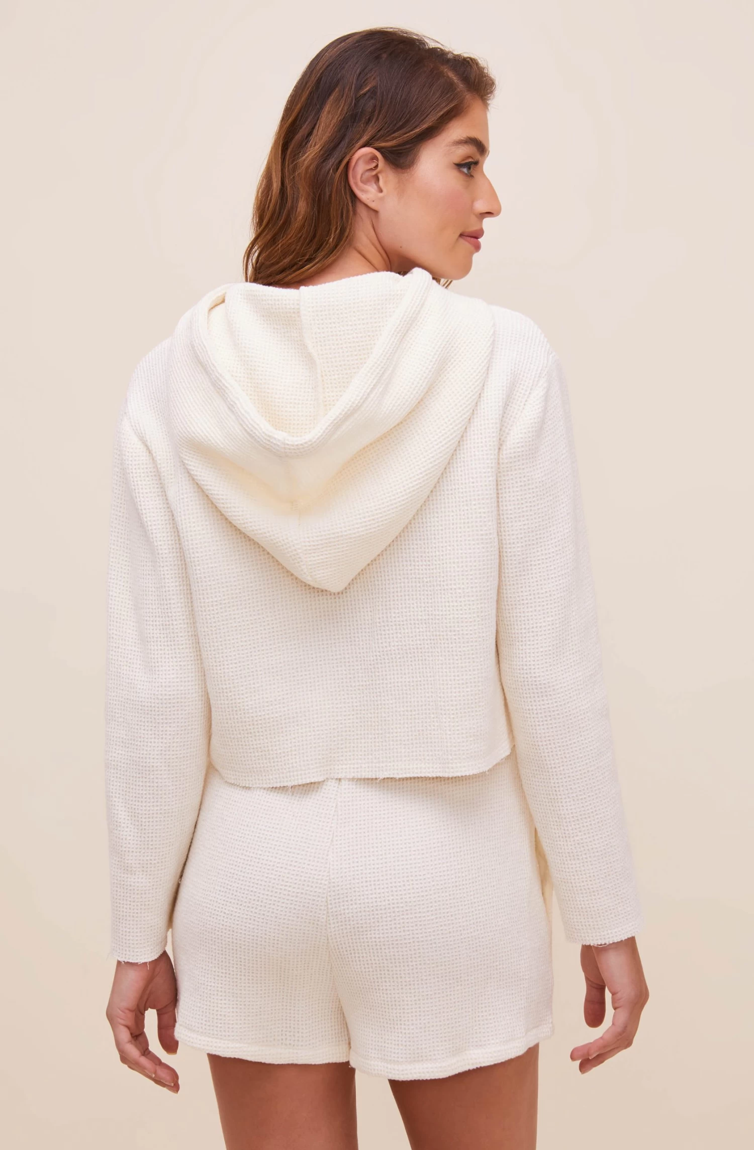 Soft, cozy and chic. The Hold Me Hoodie features a thermal waffle-knit fabrication with an attached hood and drawstring accents. Raw-cut hem and long sleeves.