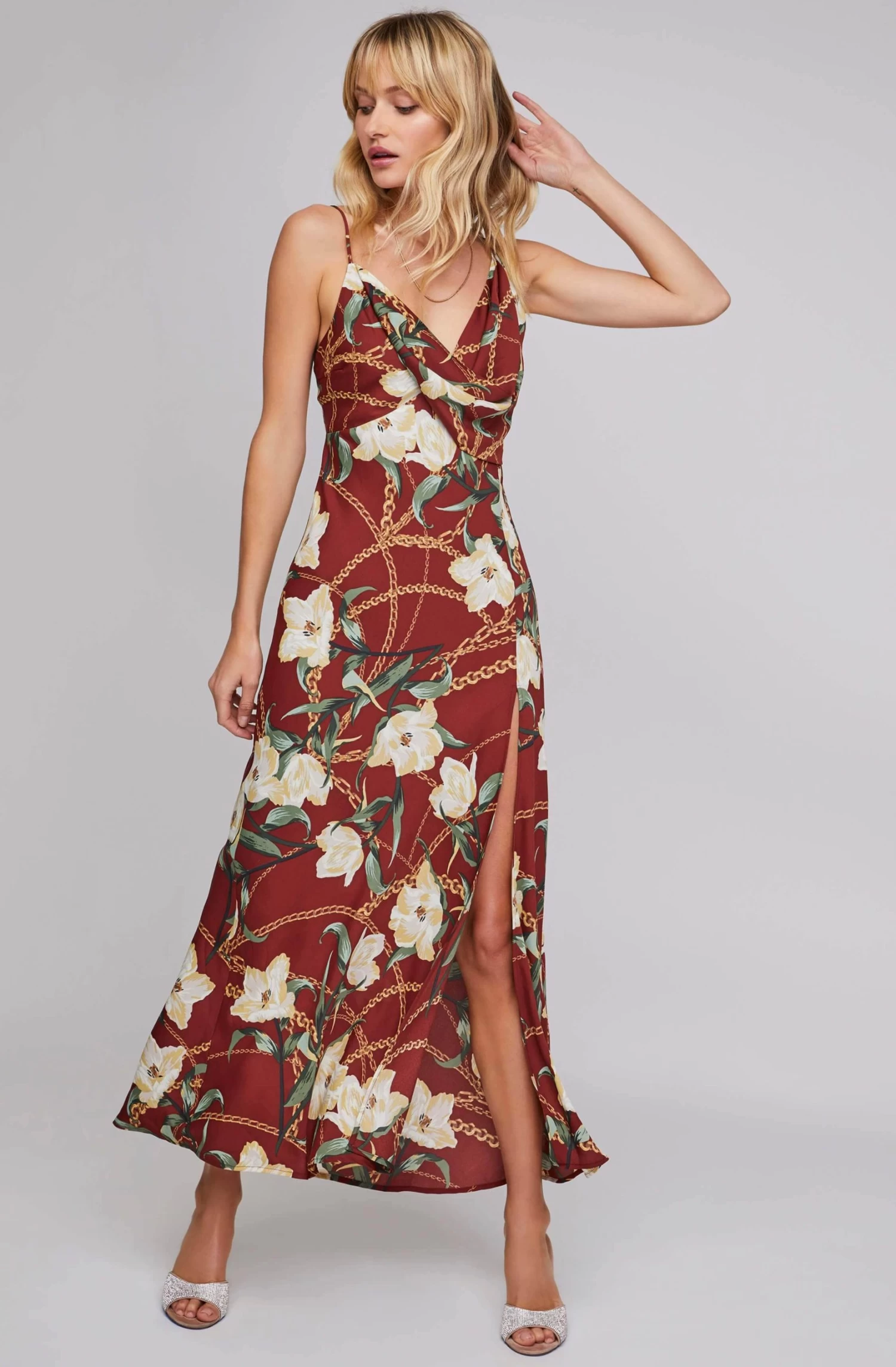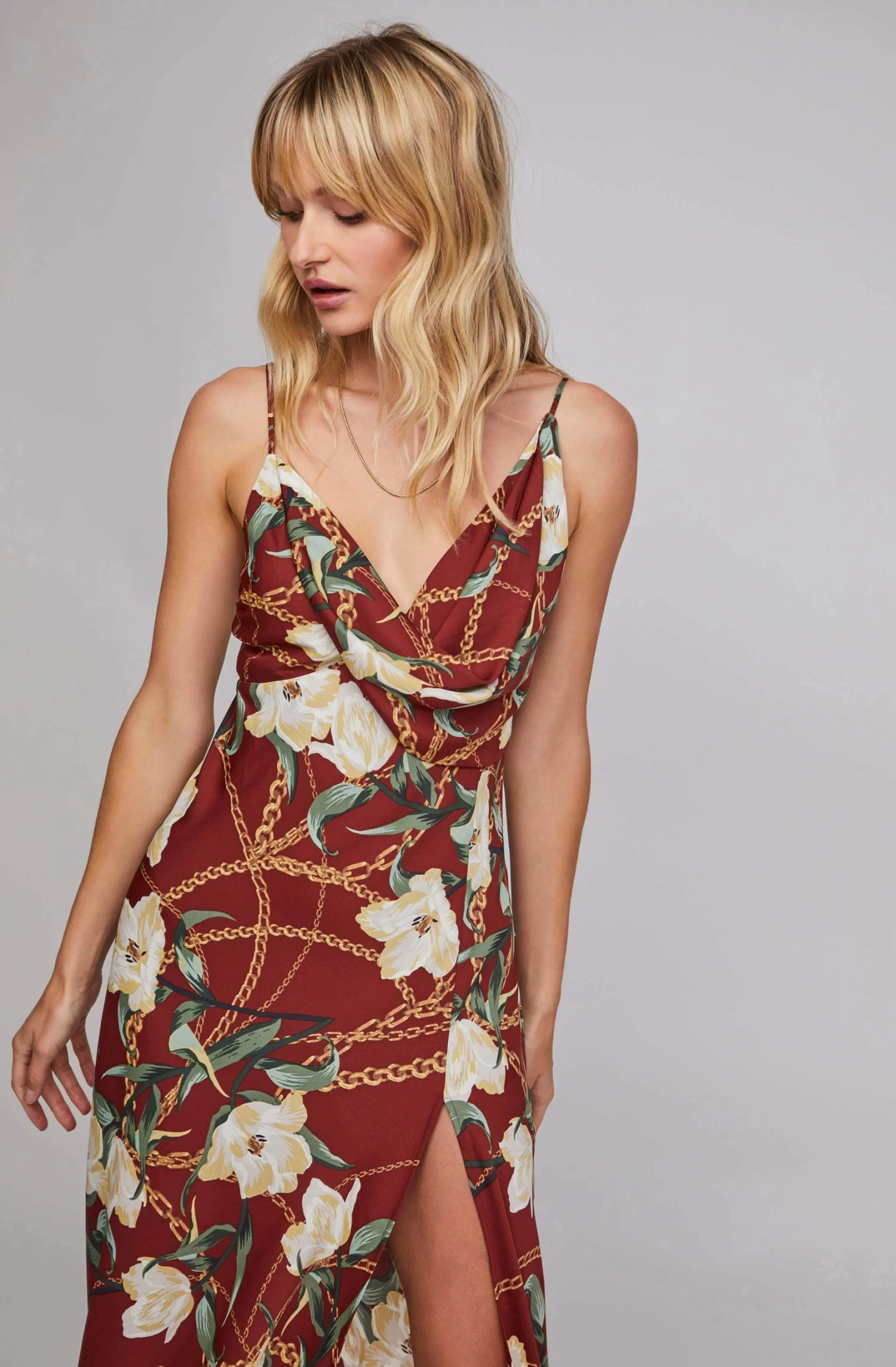 Bask in the afterglow of outfit magic! This dreamy midi dress features a signature, plunge neckline that drapes perfectly and descends to a fitted bodice. Deep, front slit accent keeps you in the land of sexy. Statement floral and chain print throughout.