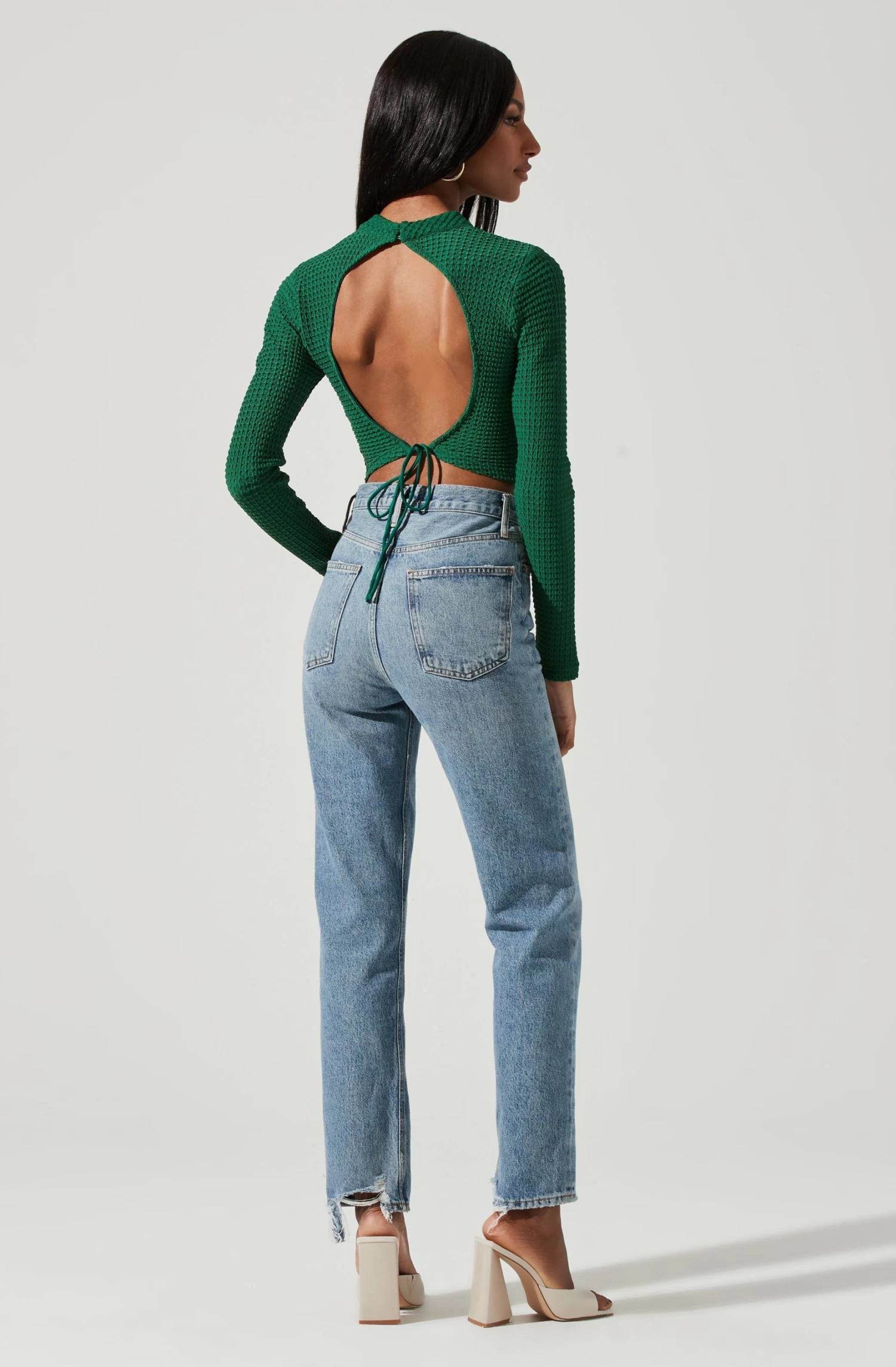 Make an outfit statement in the Kae Top. This waffle-knit style features a high neckline that leads to a fitted design with an open back and lower tie string accents. Long sleeves.