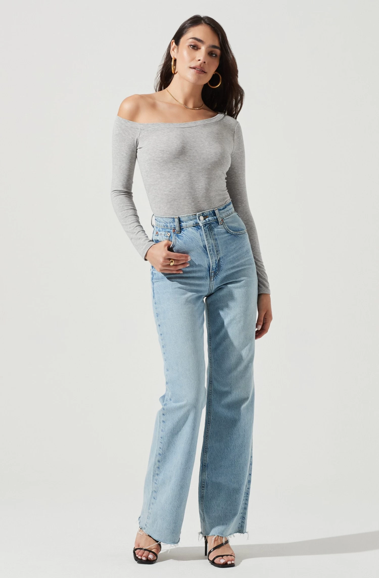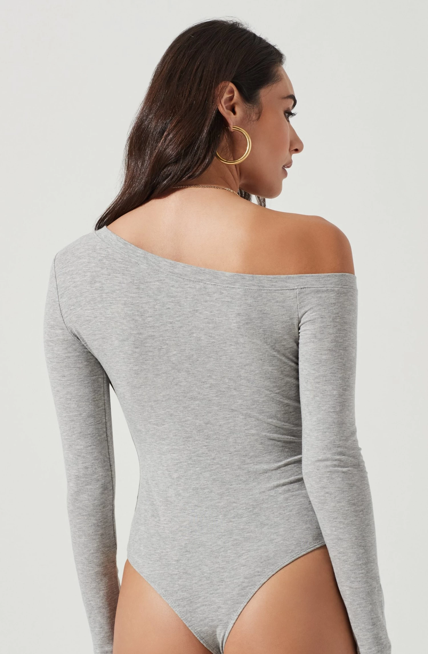 The Kaia Bodysuit has an off-shoulder neckline that exposes one shoulder and descends to a fitted silhouette. Long sleeves. Attached thong bottoms with two snap closures.