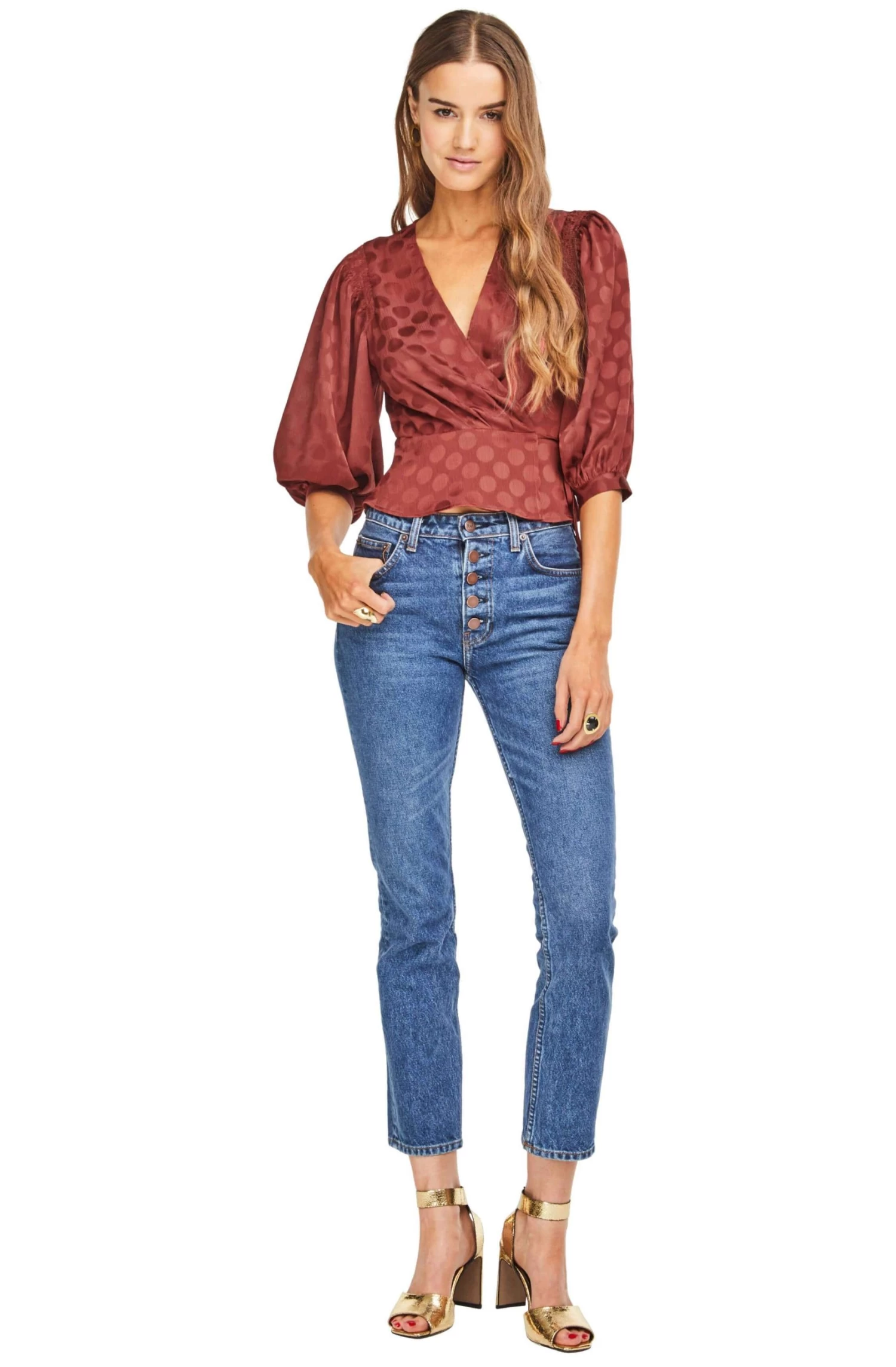 100% Polyester, Length: 22 1/8″ (Size M), Zipper Closure, Dry Clean Only, Surplice Neckline, Wrap Blouse With Adjustable Side-tie, Model is Wearing Size S, Model’s Measurements: Height 5’10” // Bust 34″ // Waist 24″ // Hips 34″, Fits True to Size, Style#ACT15036