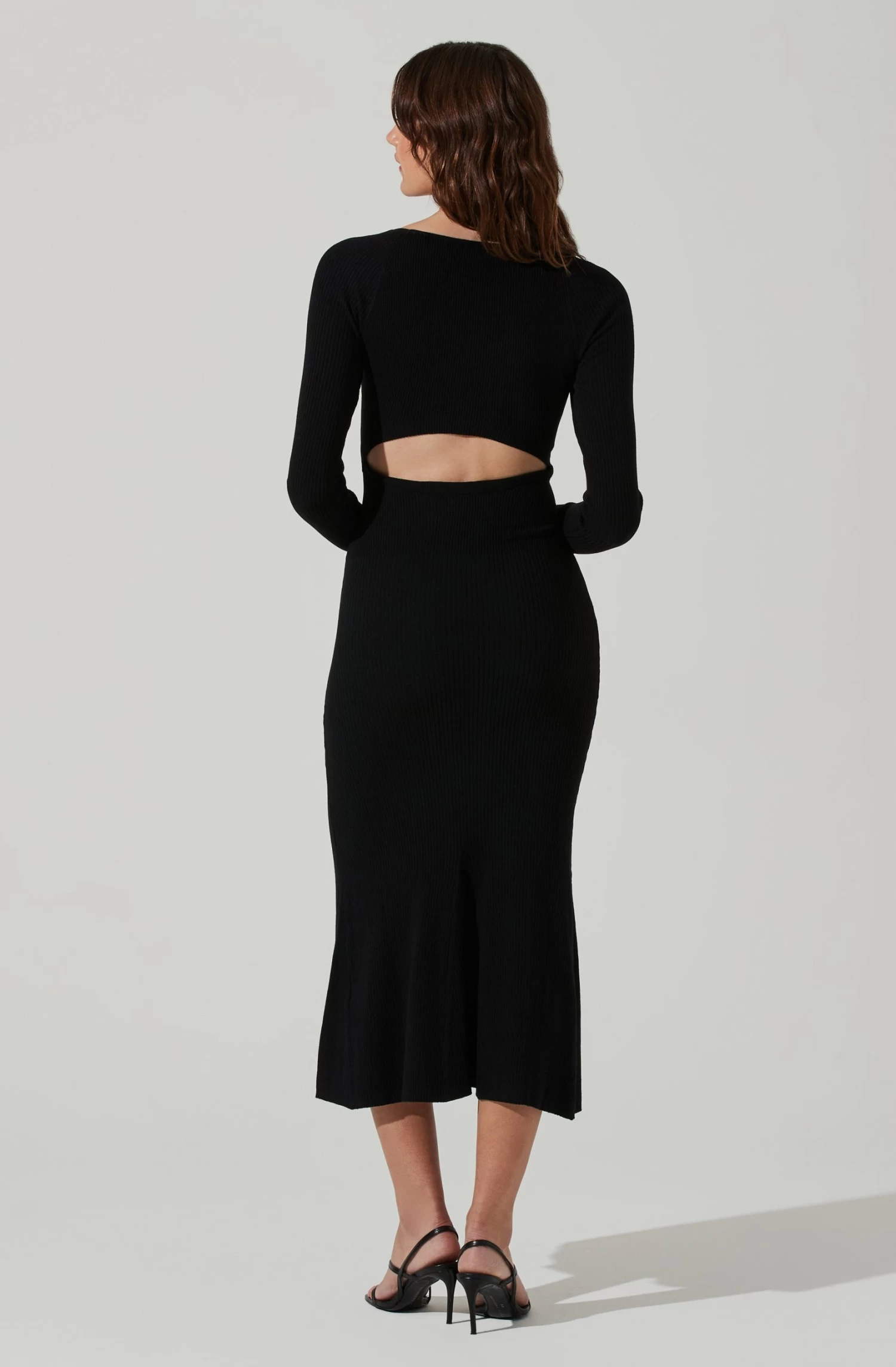 This sleek midi dress features a ribbed knit construction. Scoop neckline leads to a bodycon silhouette and slightly flared skirt. Long sleeves. Back cutout accent.