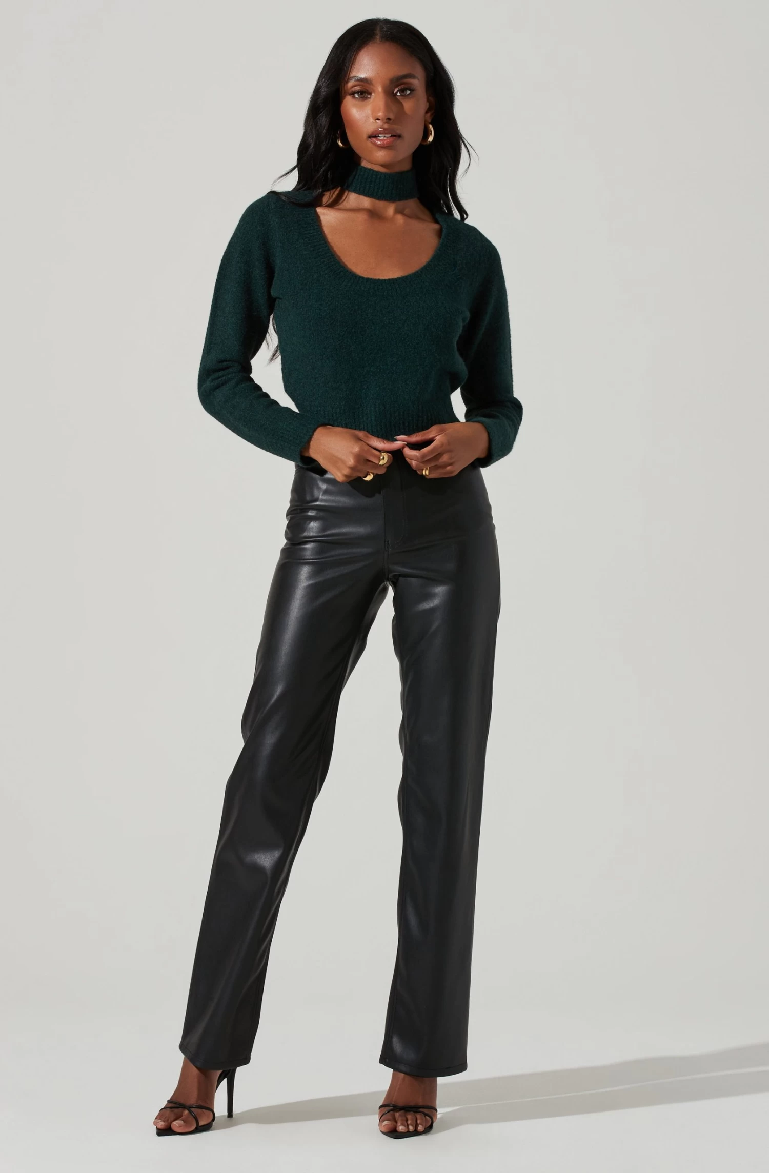 The Marion Sweater features a mock neck collar that leads to a cutout neckline. Long sleeves.