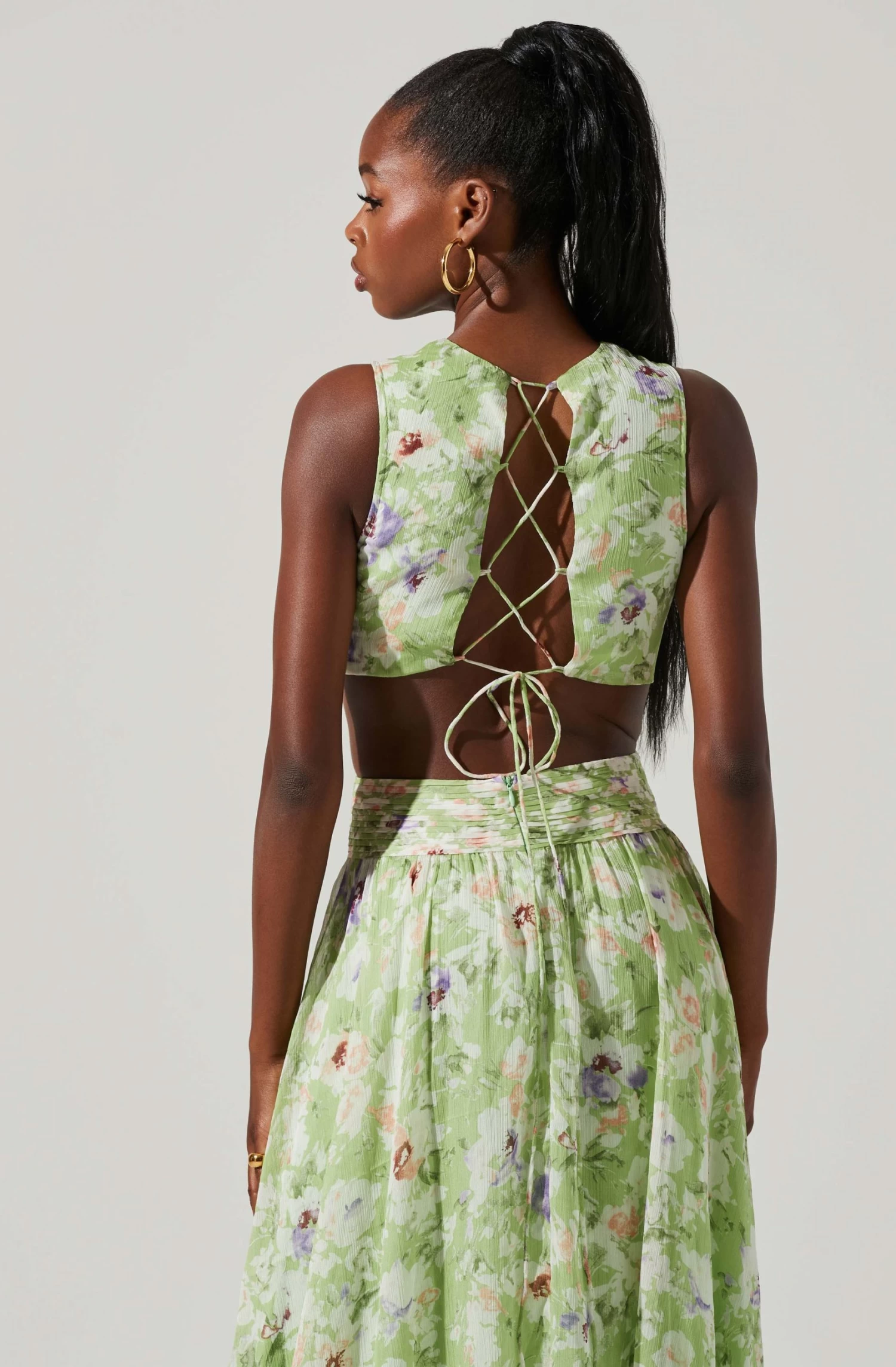 The Noya Dress features a floral print throughout. Plunging neckline leads to a cross front waist with cutout details. Ruffle maxi skirt. Lace up back. Concealed back zip closure.