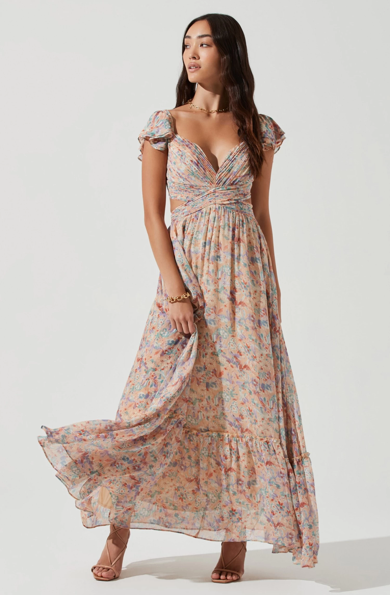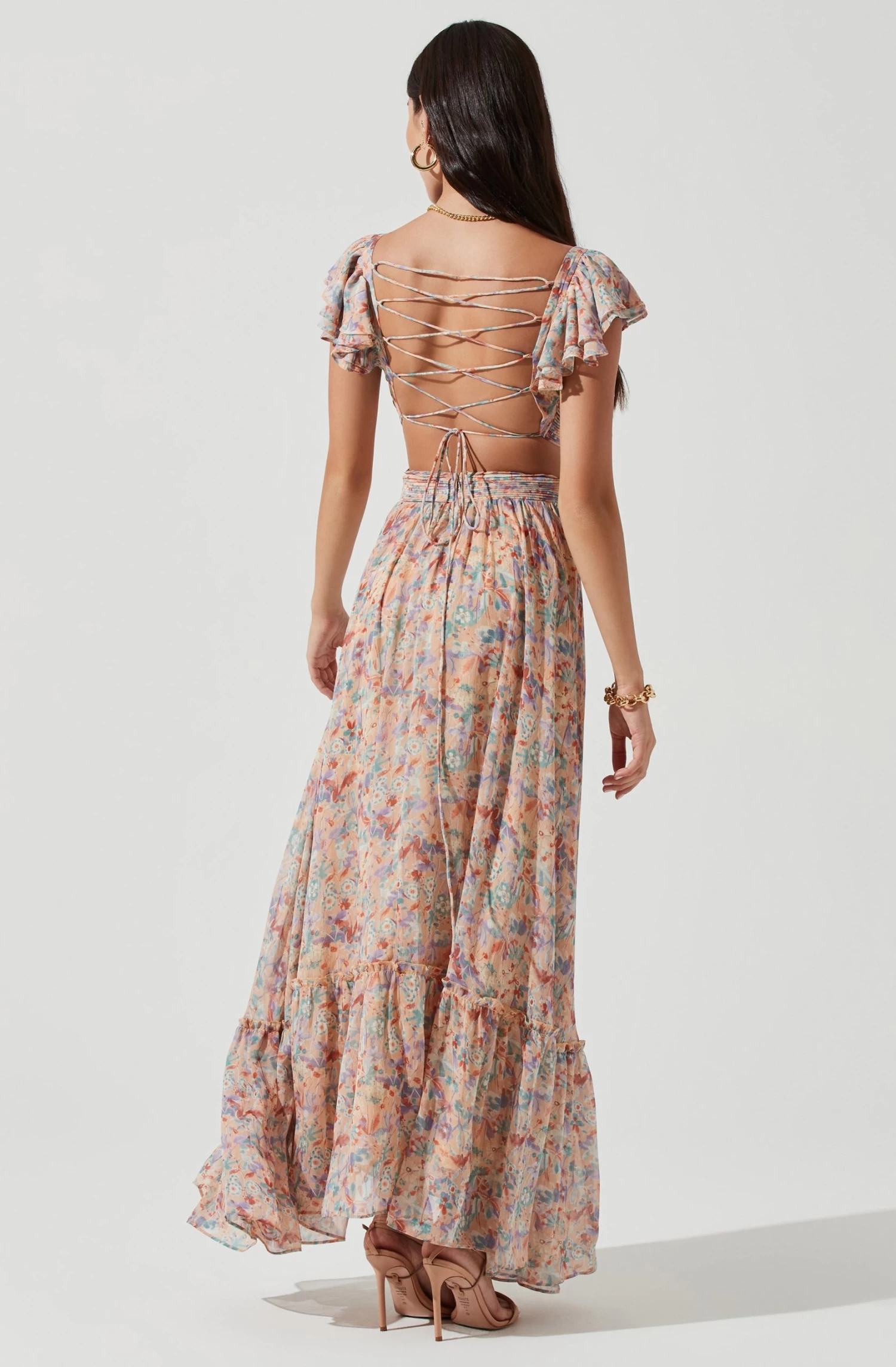 The romantic Primrose Dress features a plunge neckline that leads to a ruched bodice with side cutout accents. Ruffle sleeves. Open back features a cross strap design. Maxi-length skirt.
