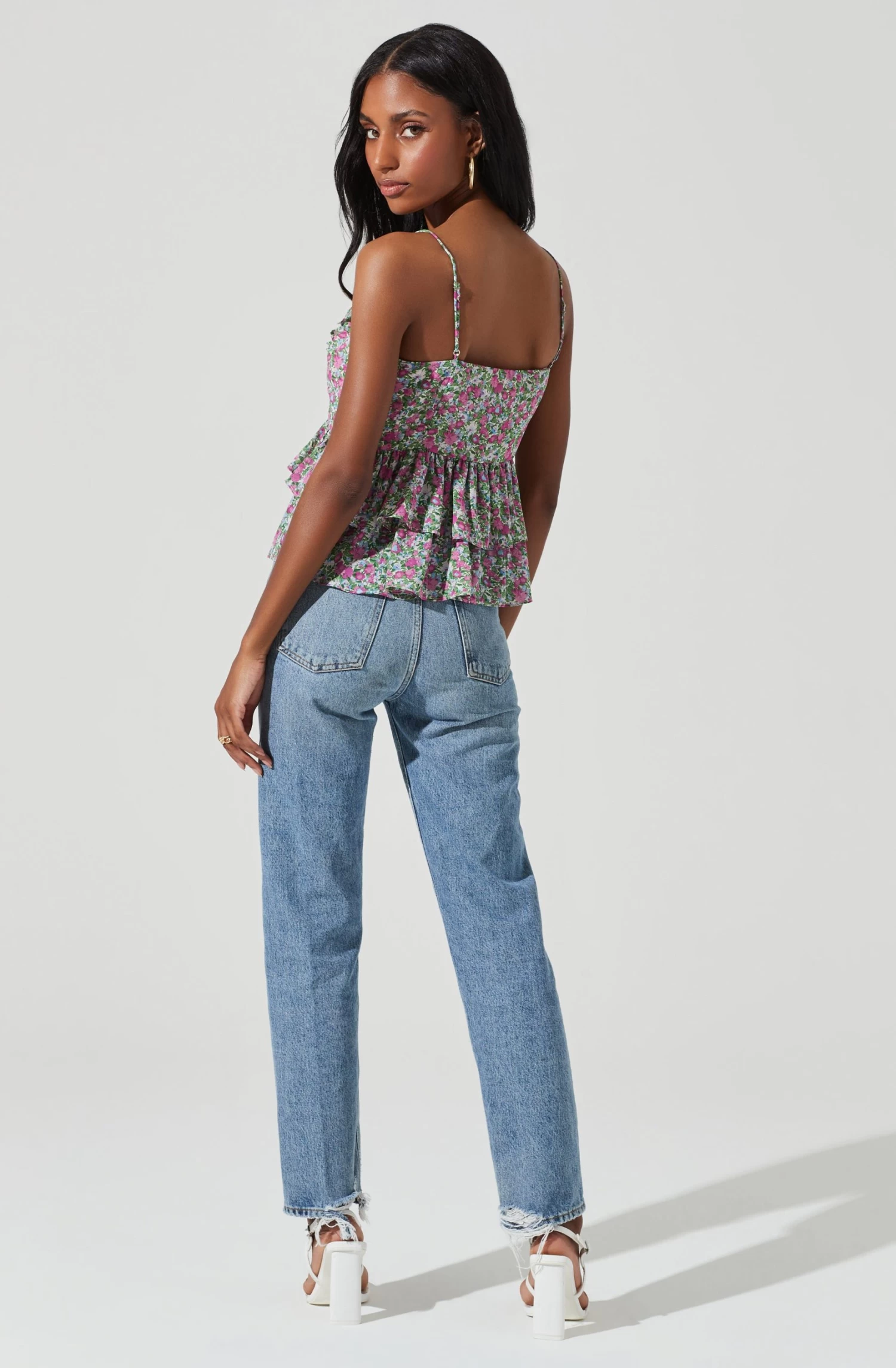 This floral cami features a V neckline with ruffle trim that leads to a tie front accent. Buttoned front and ruffle trim along the waist. Adjustable straps. Fully lined.