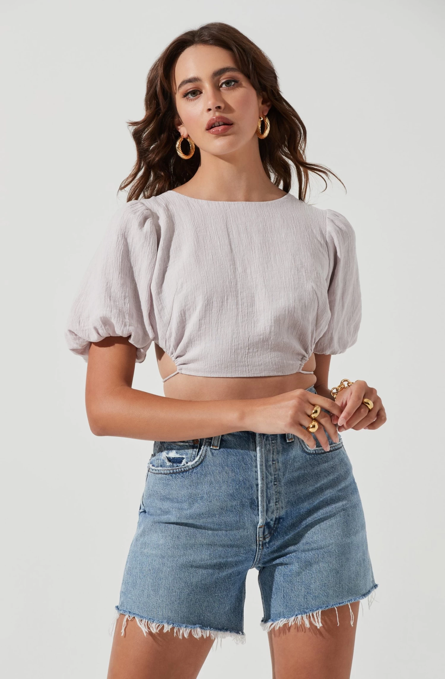 Start the season off with the Simona Top! It features a cropped hem and tie waist detail. Open back features tying straps. Short puff sleeves.