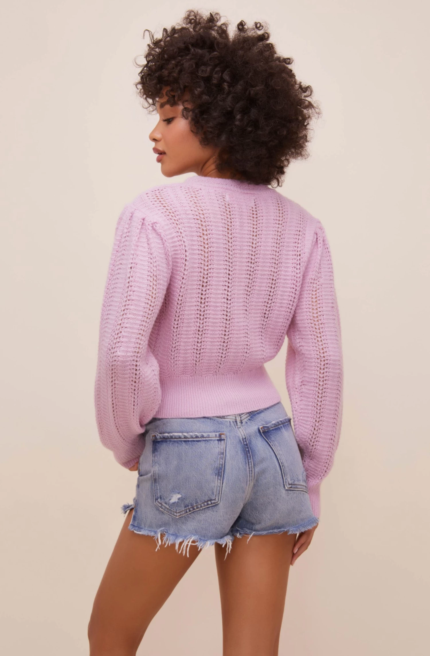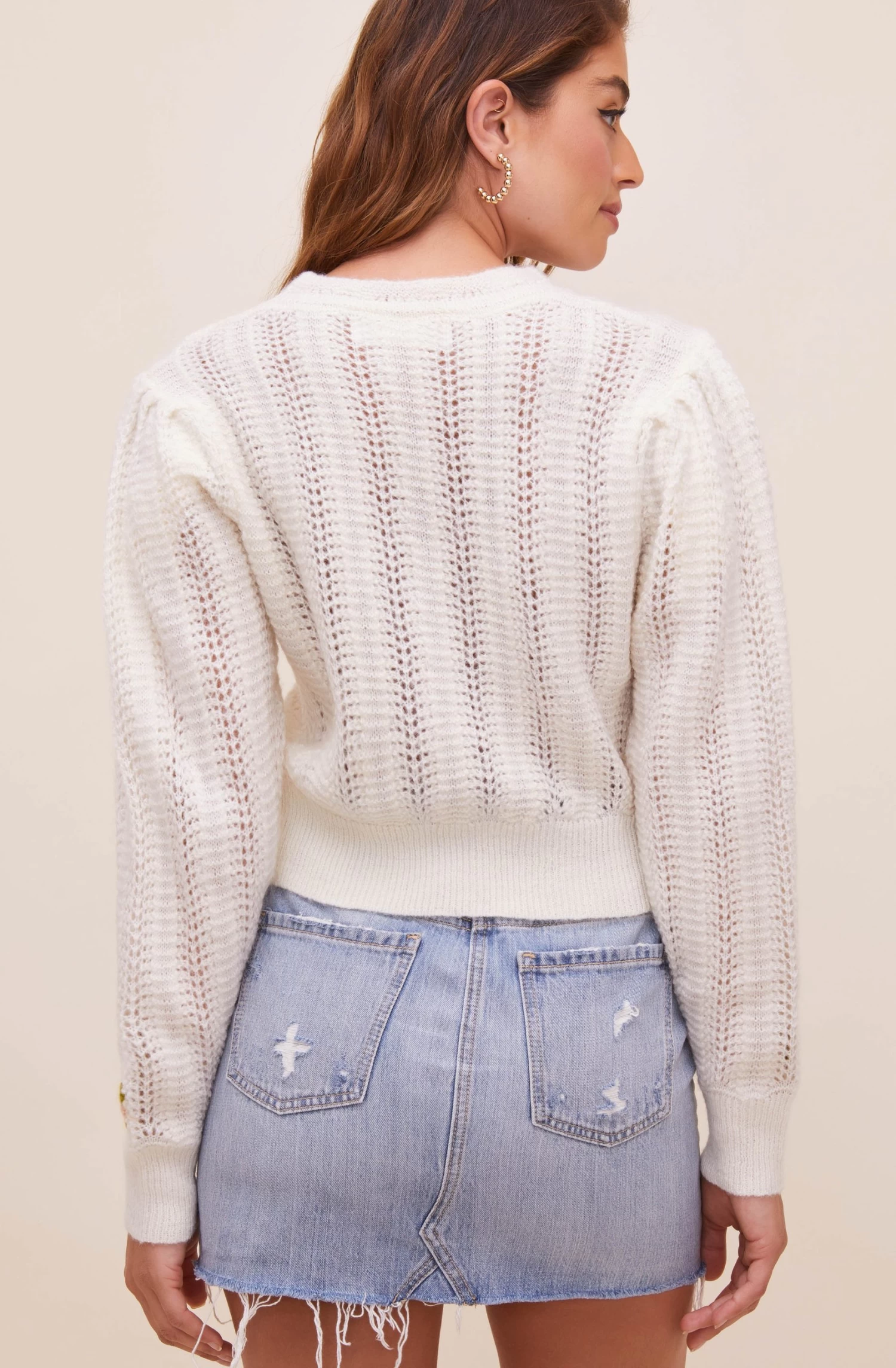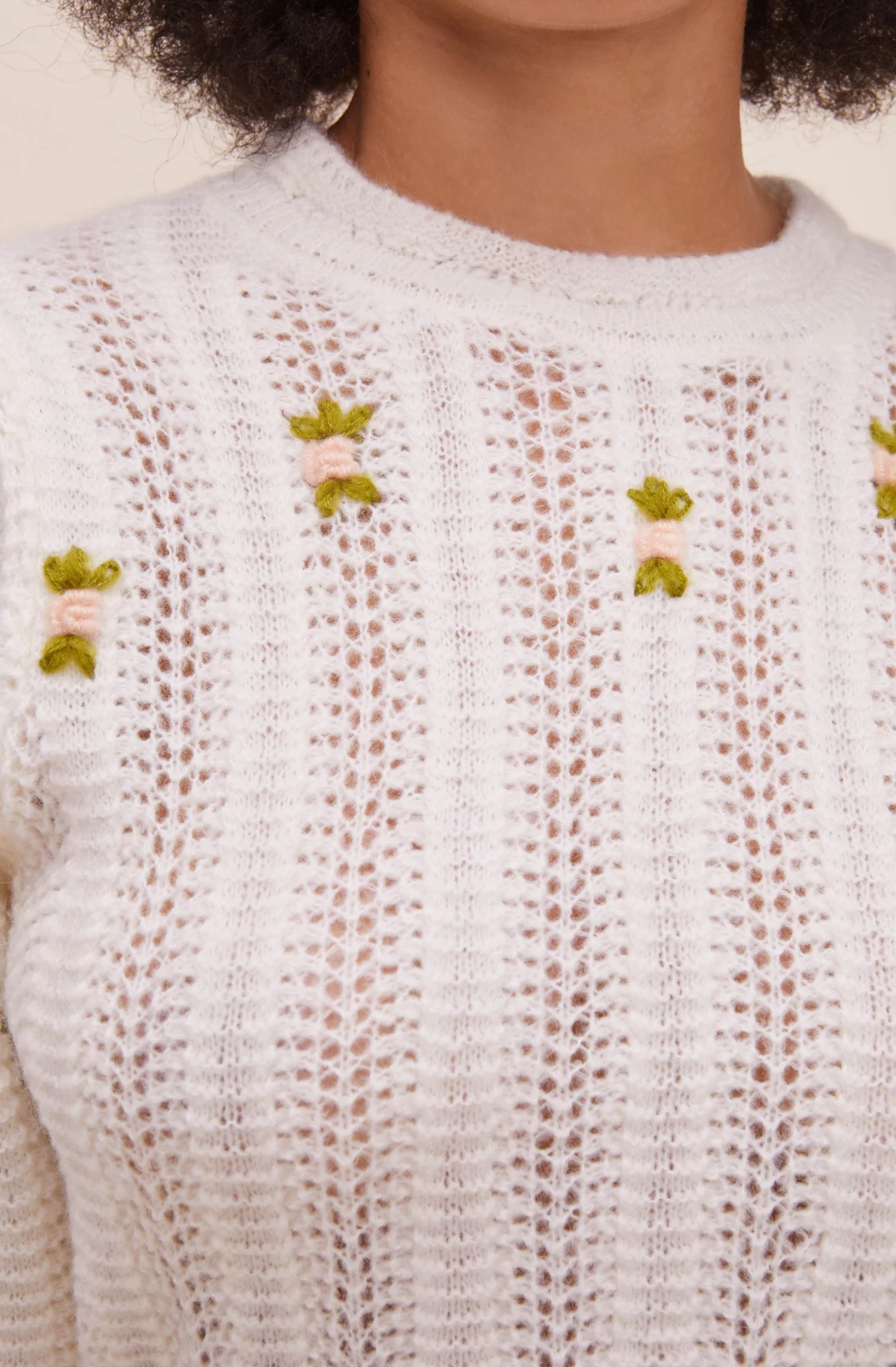 Details matter most in the Taya Sweater. It features a classic crew neckline that descends into an open weave design with petite floral buds embroidered along the front. Statement shoulders with long sleeves and matching embroidered florals at the cuffs.