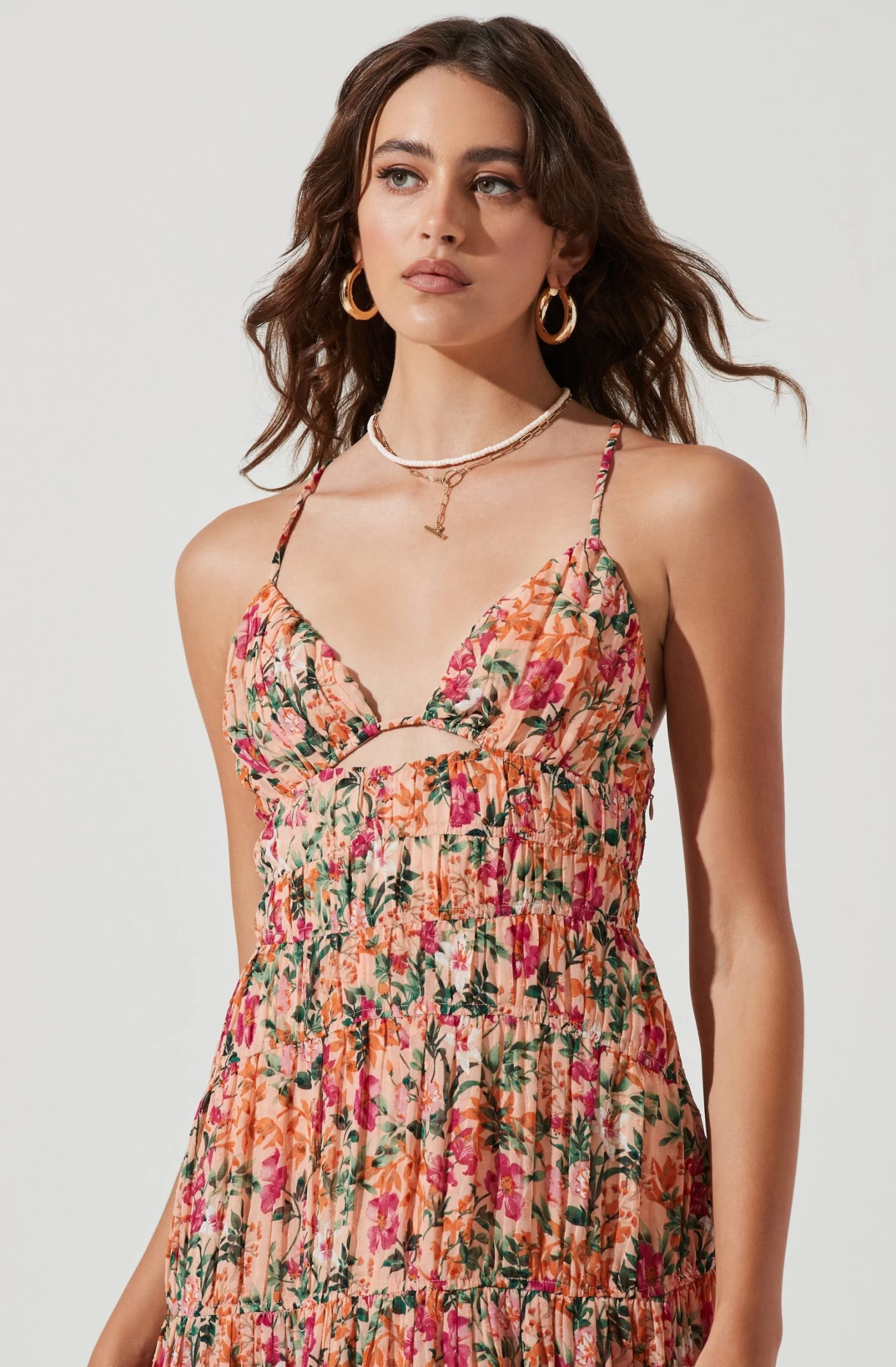 This statement occasion dress features a plunging neckline that leads to a front cutout accent at the bust. Flattering pleating throughout. Side slit accent. Open back with adjustable cross straps.