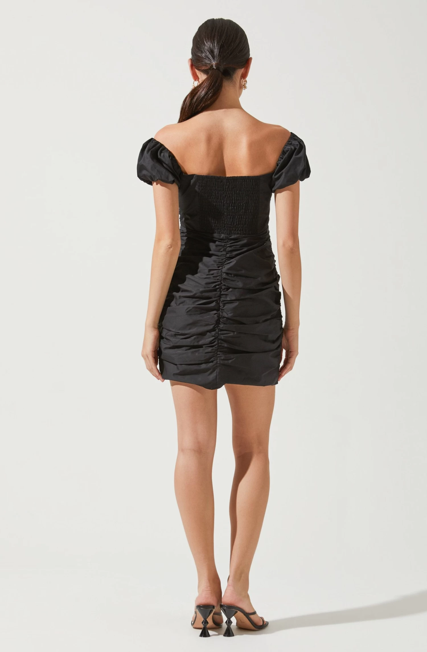 The Tyra Dress features a sweetheart neckline supported by short puff sleeves. Bodycon fit with ruching throughout. Abbreviated hem. Smocked back.
