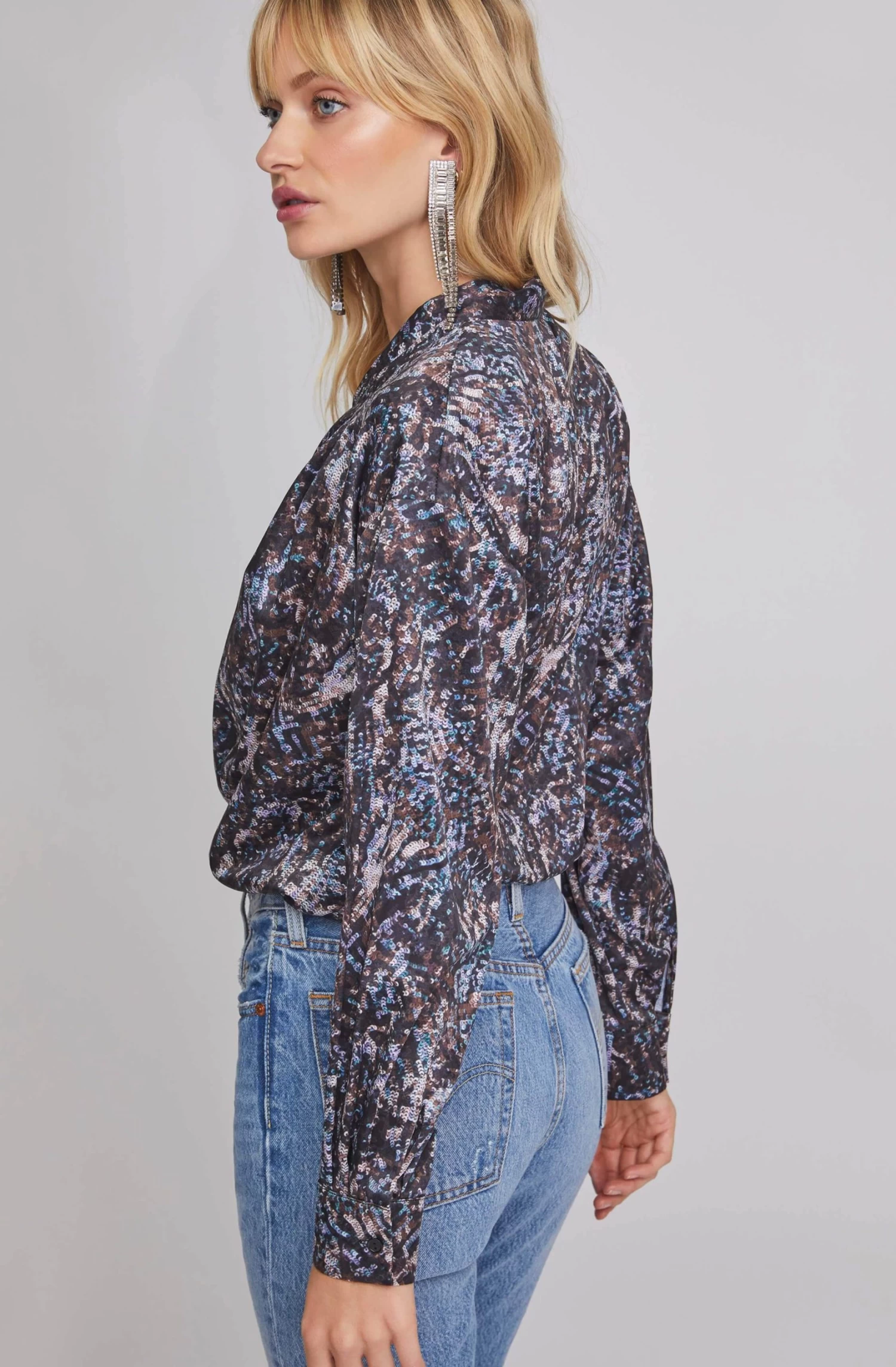 Everything is better in a bodysuit! This sexy one piece wonder features a printed sequin design with a plunging neckline, wrap bodice and long sleeves.