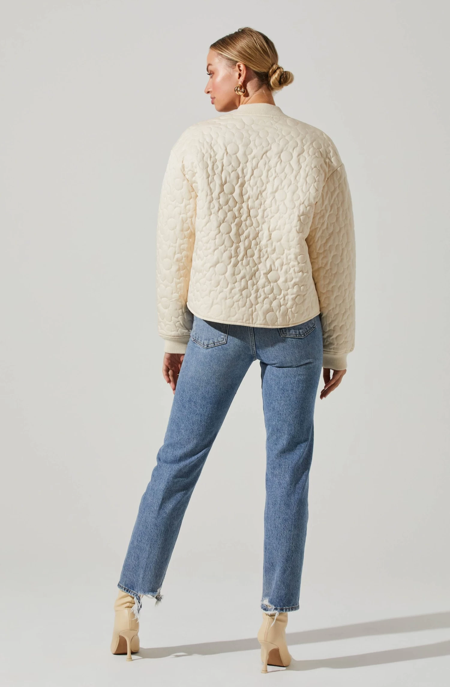 The Zenni Jacket features woven quilted fabric in a floral design. Long sleeves and drop shoulders. Snap button placket on the front. Ribbed knit cuffs.